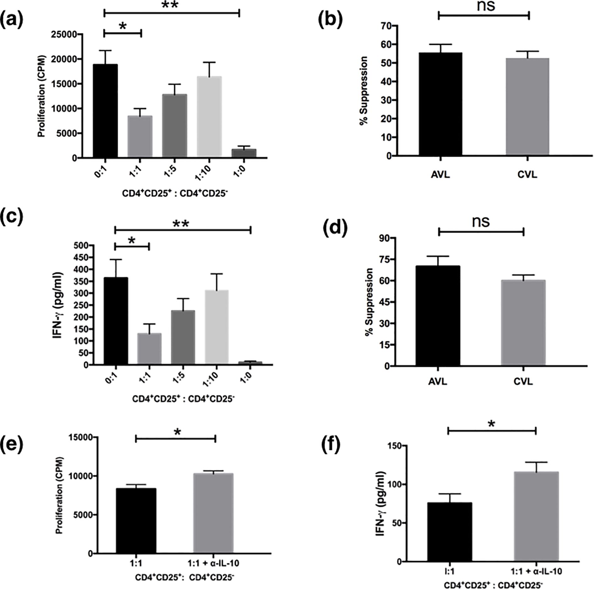 Figure 3. Treg cells from the PBMCs of VL patients suppress proliferation and cytokine production of effector cells. MACS sorted CD4+CD25+ cells and CD4+CD25- cells of active VL patients (n=5) were cultured (1×105 cells/well) in U - bottom tissue culture plates either alone or cocultured at ratios of 1:1, 1:5 and 1:10 and stimulated with soluble anti CD3 (1μg/ml) and anti CD28 (1μg/ml) for 5 days. For the last 18 hours the cultures were pulsed with 0.5 μCi/well of [3H]-thymidine. Cytokines were detected from the cell culture supernatants after 4 days of coculture through ELISA. (a) CD4+CD25+ cells suppressed the proliferation of CD4+CD25- cells in a dose dependent manner. (b) Comparison of percentage suppression of proliferation by CD4+CD25+ cells from active and cured VL (n=5) subjects when cocultured with CD4+CD25- effector cells at 1:1 ratio. (c) Detection of IFN-γ from the coculture experiments. Maximum IFN-γ was produced by CD4+CD25- T cells which were reduced after coculture with CD4+CD25+ cells in a dose dependent manner. (d) Comparison of percentage suppression of IFN-γ production by CD4+CD25+ cells from active and cured VL subjects when cocultured with CD4+CD25- effector cells at 1:1 ratio. Neutralization with anti-IL-10 in cocultured experiment (1:1 ratio) significantly restored the proliferation (e) and IFN-γ production (f) in active VL (n=6). Data represented as mean ± SEM for proliferation and cytokine analysis. Percentage suppression was calculated as follows: [1 - (mean CPM/cytokine of coculture wells)/(means CPM/cytokine of CD4+CD25- cells cultured alone)] × 100; where CPM indicates counts per minute. Values for p were calculated using Mann-Whitney U test; p < 0.05 was considered significant. 0.1234 (ns), 0.0332 (*), 0.0021 (**).