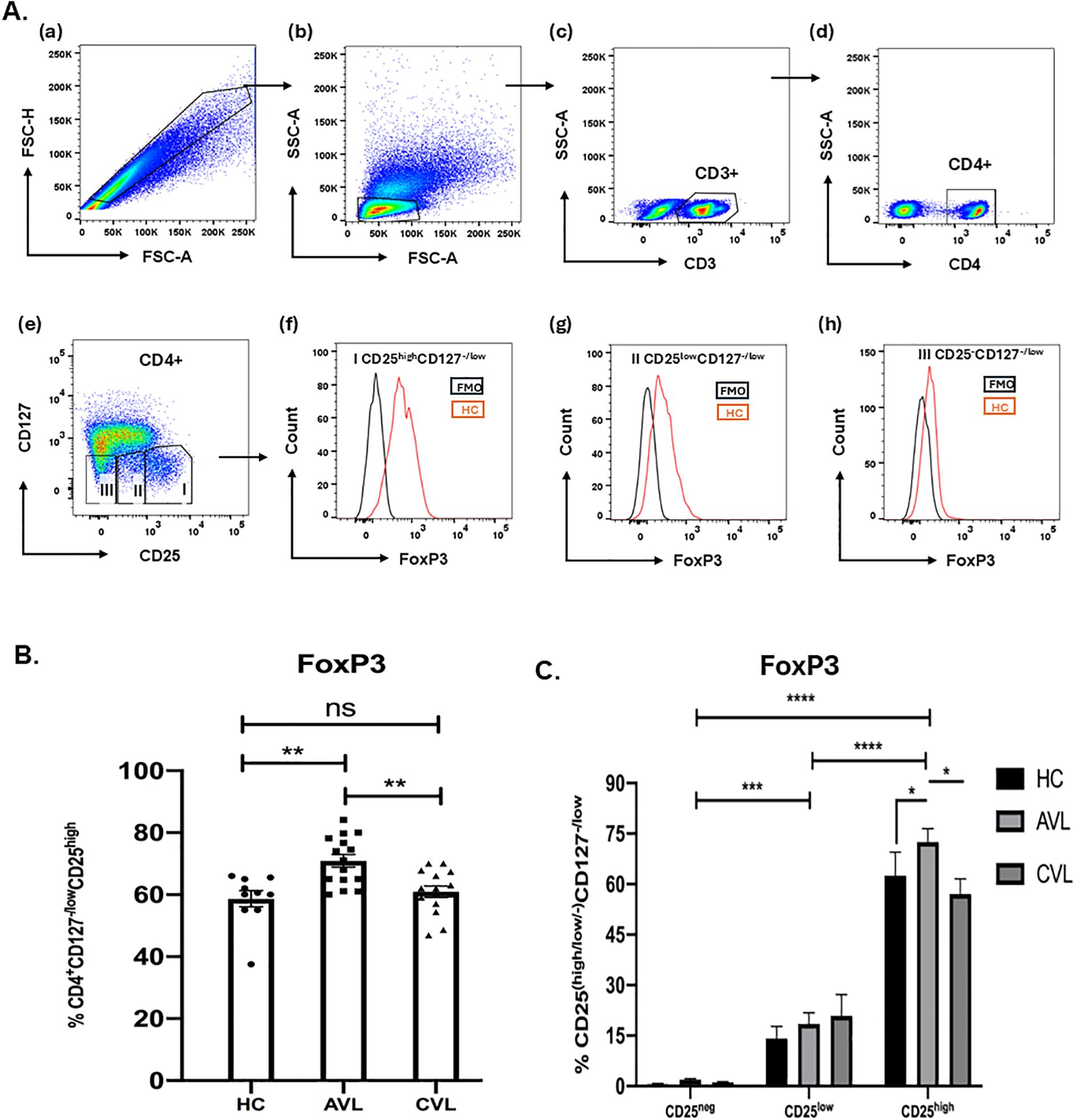 Figure 4. FoxP3 staining of CD4+CD127-/lowCD25+ Tregs. Freshly isolated PBMCs from the blood of active VL, cured VL and healthy control, both for unpaired (B) (AVL; n = 15, CVL; n = 15, HC; n = 10) and paired samples (C) (AVL; n = 5, CVL; n = 5, HC; n = 7) were stained ex vivo for CD3, CD4, CD127 and CD25 followed by intracellular staining for FoxP3 T cells (A). Total percentage of FoxP3 of the CD4+CD127-/lowCD25high (B) and CD25-, CD25low and CD25high were determined through flow cytometry (C). P values were calculated using Wilcoxon matched pairs signed rank test for paired samples and p < 0.05 was considered significant. Unpaired data (B) were analyzed using ordinary one-way ANOVA with a single pooled variance, followed by Tukey’s multiple-comparisons test. 0.1234 (ns), 0.0332 (*), 0.0021 (**), 0.0002 (***), <0.0001 (****).