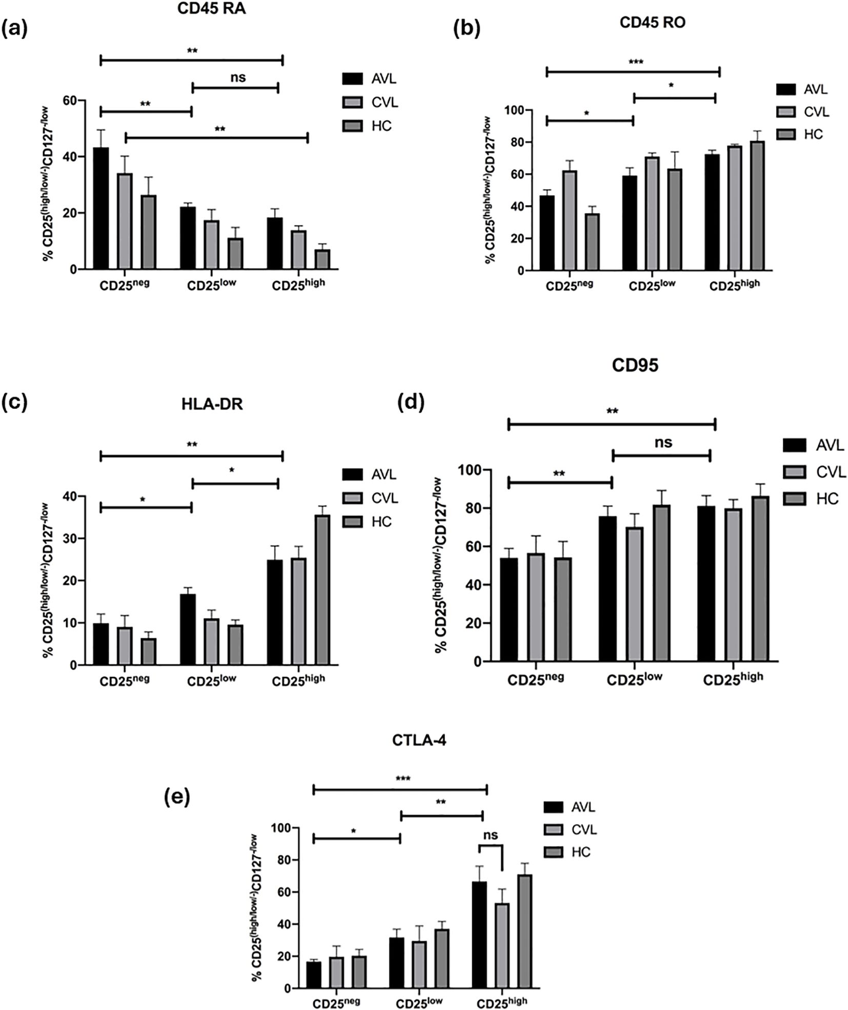 Figure 5. CD25high Treg cells in VL infection show conventional phenotypes. Fresh whole blood of active VL (n=5), recovered (n=5) and healthy subjects (n=5) were stained ex vivo for CD3, CD4, CD127, CD25, and (a) CD45RA, (b) CD45RO, (c) HLA-DR, (d) CD95 and (e) CTLA-4 and analyzed through flow cytometry. CD25-, CD25low, and CD25high cells were compared. The results are expressed as the mean ± SEM for the active VL (AVL), cured VL (CVL) and healthy control. P values were calculated using Wilcoxon matched pairs signed rank test for paired samples and p < 0.05 was considered significant. 0.1234 (ns), 0.0332 (*), 0.0021 (**), 0.0002 (***).