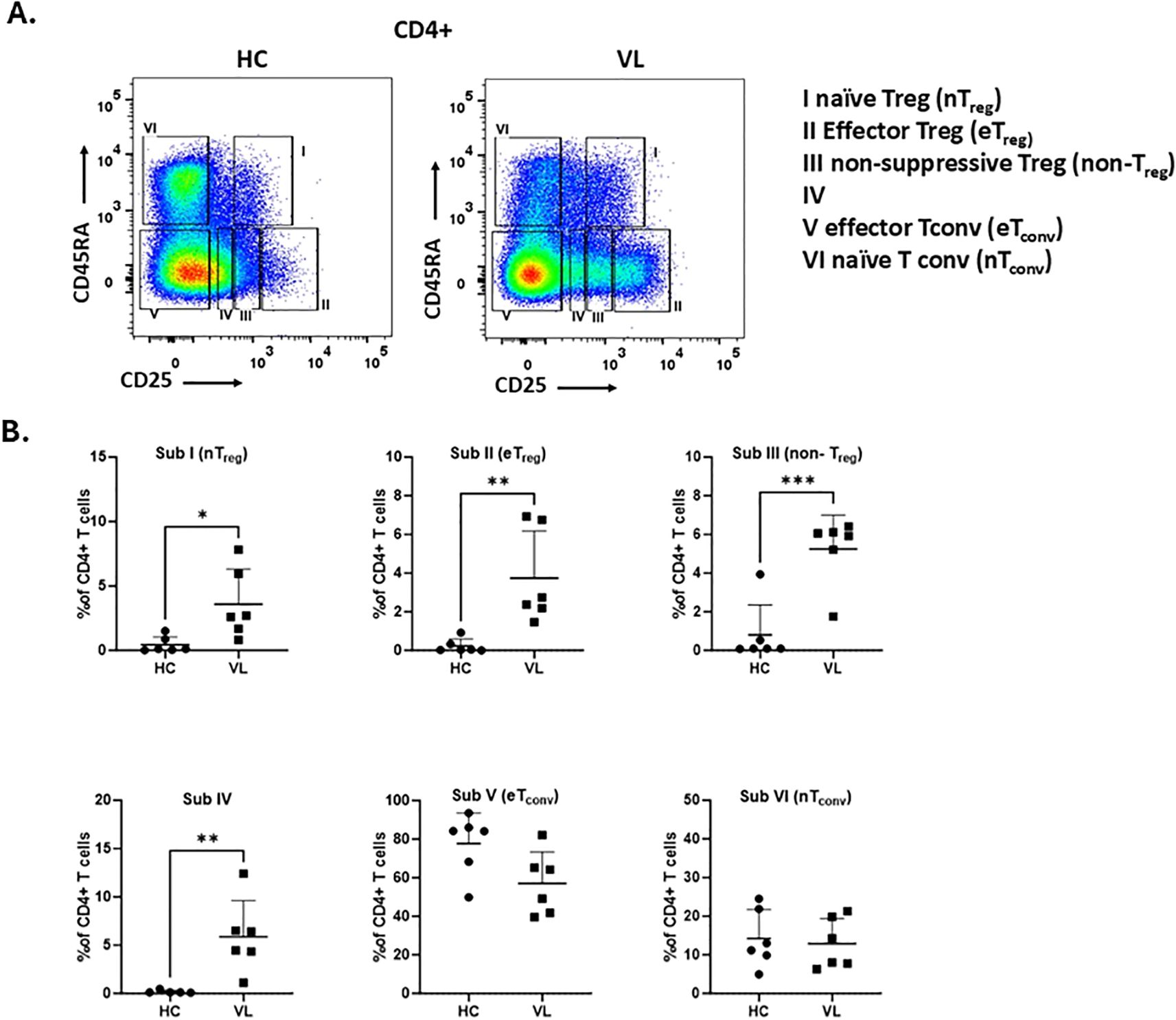Figure 6. The frequency of effector Treg subpopulations is increased in the peripheral blood from VL patients. (A) Gating strategy to define six CD4+ T cell subpopulations based on differential expression of CD25 and CD45RA.: CD25intCD45RA+ cells (Subgroup I, naïve Treg), CD25highCD45RA− cells (Subgroup II, effector Treg), CD25intCD45RA− cells (Subgroup III, non-suppressive Treg), CD25lowCD45RA− cells (Subgroup IV), CD25−CD45RA− cells (Subgroup V, effector Tconv), and CD25−CD45RA+ cells (Subgroup VI, naïve Tconv). (B) Frequency of each subgroup within CD4+ T cells from PBMCs of healthy controls (HC, n = 6) and VL patients (n = 6). Statistical differences between HC and VL were assessed using t-test and shown as p-values. 0.0332 (*), 0.0021 (**), 0.0002 (***).