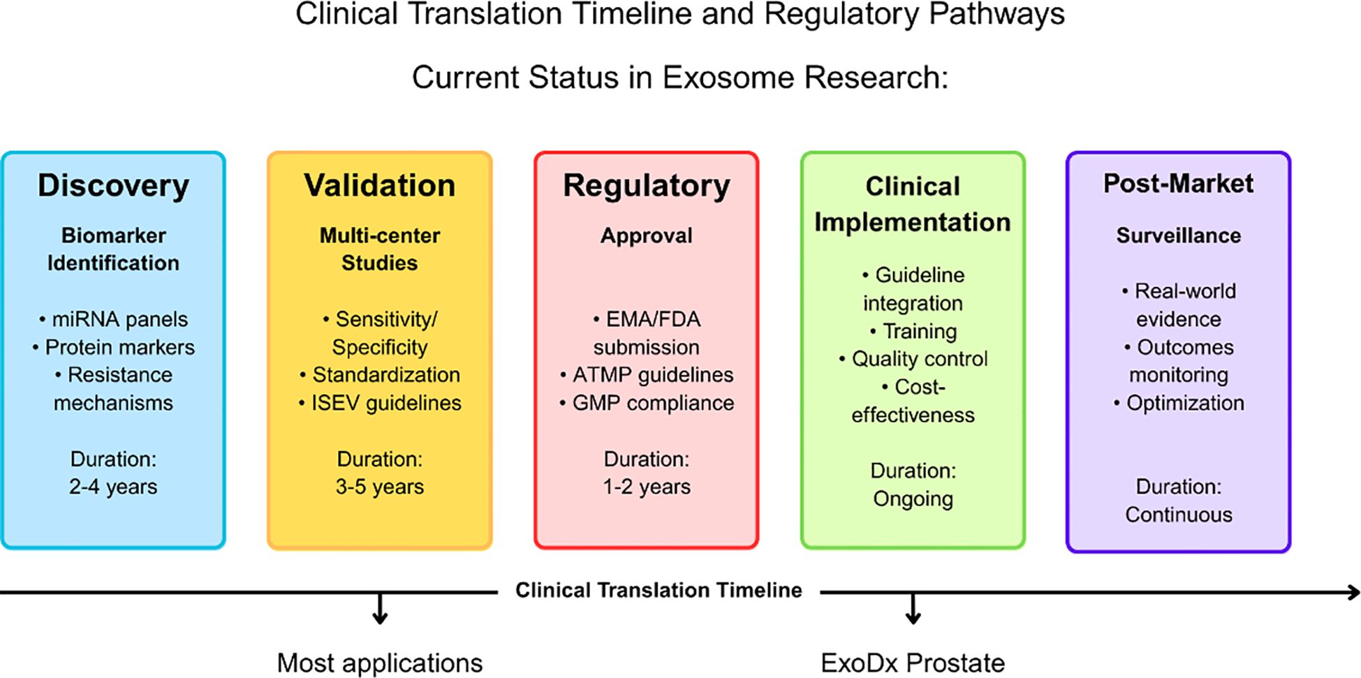 Figure 1. Clinical translation timeline and regulatory pathways for exosome-based applications in leukemia. The timeline illustrates the progression from discovery through post-market surveillance, with duration estimates for each phase. The current status indicates that most exosome applications remain in the discovery and validation phases, while the ExoDx Prostate test represents a successful example of clinical implementation. Key activities and regulatory requirements are outlined for each phase, including EMA/FDA approval processes and ATMP guidelines compliance.