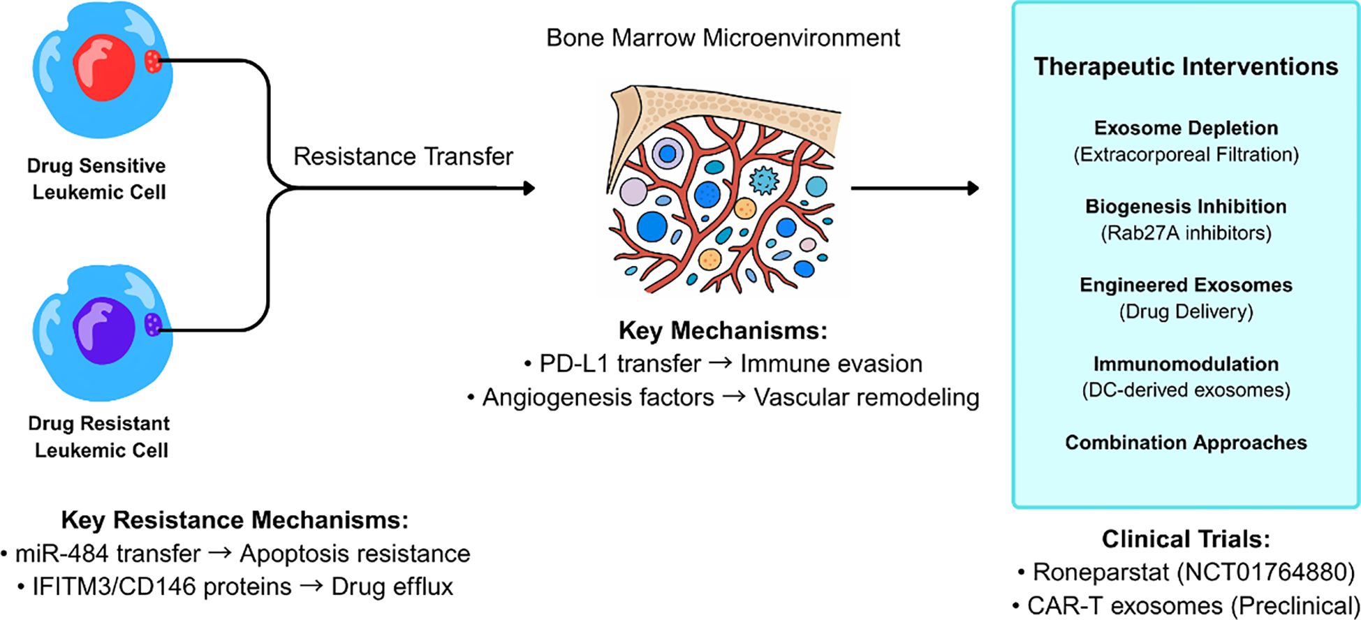 Figure 2. Exosome-mediated drug resistance mechanisms and therapeutic intervention strategies in leukemia. Drug-resistant leukemic cells transfer resistance traits to drug-sensitive cells through exosome-mediated intercellular communication within the bone marrow microenvironment. Key resistance mechanisms include miR-484 transfer leading to apoptosis resistance and IFITM3/CD146 protein transfer promoting drug efflux. Therapeutic interventions target multiple pathways including exosome depletion, biogenesis inhibition, and immunomodulation, with clinical trials of Roneparstat and CAR-T derived exosomes showing promise.