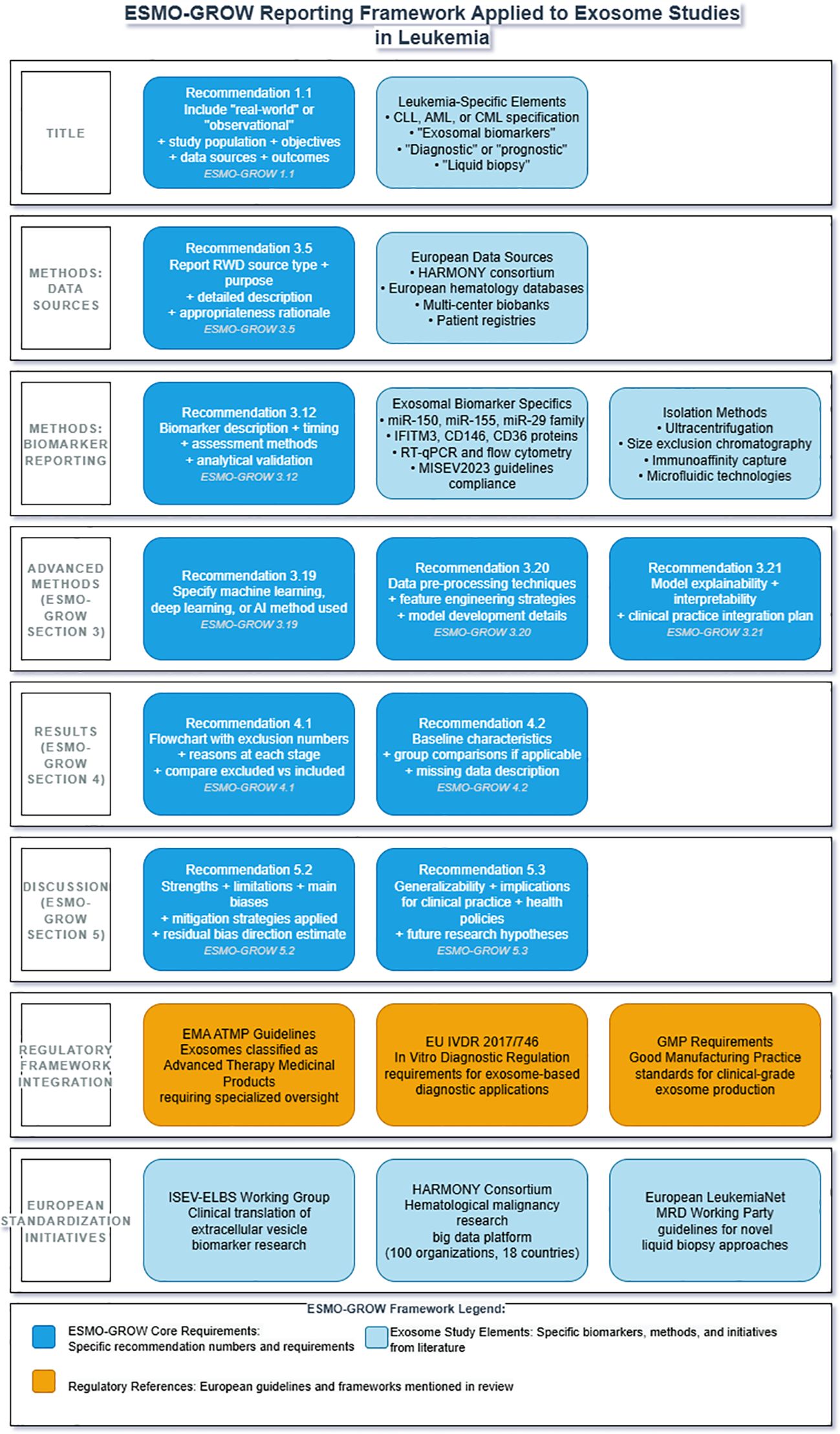 Figure 3. ESMO-GROW reporting framework applied to exosome studies in leukemia clinical research. Framework integrates European Society for Medical Oncology Guidance for Reporting Oncology real-World evidence (ESMO-GROW) with leukemia-specific requirements. Core reporting elements include title specifications (1.1), data source documentation (3.5), biomarker validation (3.12) for exosomal miR-150, miR-155, miR-29 family, IFITM3, CD146, and CD36 using RT-qPCR and flow cytometry, advanced methodology reporting (3.19-3.21), results documentation with flowcharts (4.1-4.2), and discussion requirements (5.2-5.3). Regulatory compliance encompasses EMA ATMP guidelines, EU IVDR (2017/746), GMP standards, and MISEV 2023. European collaborative initiatives include the HARMONY consortium, the ISEV-ELBS Working Group, and the European LeukemiaNet MRD Working Party. ATMP, advanced therapy medicinal product; EMA, European Medicines Agency; ESMO-GROW, European Society for Medical Oncology Guidance for Reporting Oncology real-World evidence; HARMONY, Hematology Alliance for Research Monitoring Outcomes and Needs; ISEV-ELBS, International Society for Extracellular Vesicles-European Liquid Biopsy Society; IVDR, In Vitro Diagnostic Regulation; MISEV, Minimal Information for Studies of Extracellular Vesicles; MRD, minimal residual disease.