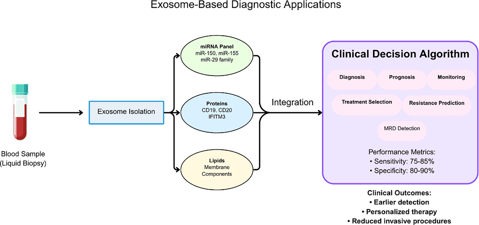 Figure 4. Workflow for exosome-based diagnostic applications in leukemia liquid biopsy. Blood samples undergo exosome isolation followed by comprehensive molecular analysis of miRNA panels (miR-150, miR-155, miR-29 family), protein markers (CD19, CD20, IFITM3), and lipid components. The integration of multimodal biomarker data into clinical decision algorithms supports diagnosis, prognosis, treatment selection, and monitoring of minimal residual disease. Performance metrics demonstrate sensitivity of 75-85% and specificity of 80-90%, enabling earlier detection, personalized therapy, and reduced invasive procedures.