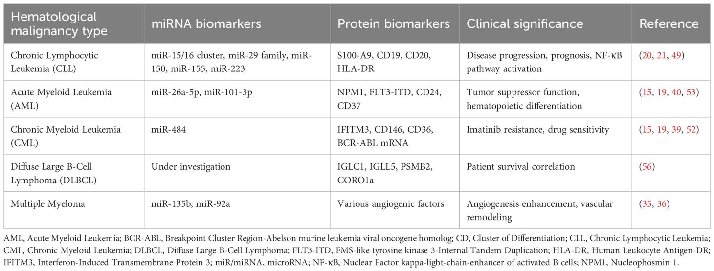 Despite extensive preclinical research, the clinical trial landscape for exosomal biomarkers in hematological malignancies remains limited. Current registered trials focus primarily on exosome characterization (NCT03275363, NCT03944603) (94) rather than biomarker validation for hematological disorders. Clinical trials evaluating exosome-based immunotherapy (NCT05375604) target solid tumors, with limited representation of hematological malignancies (95).