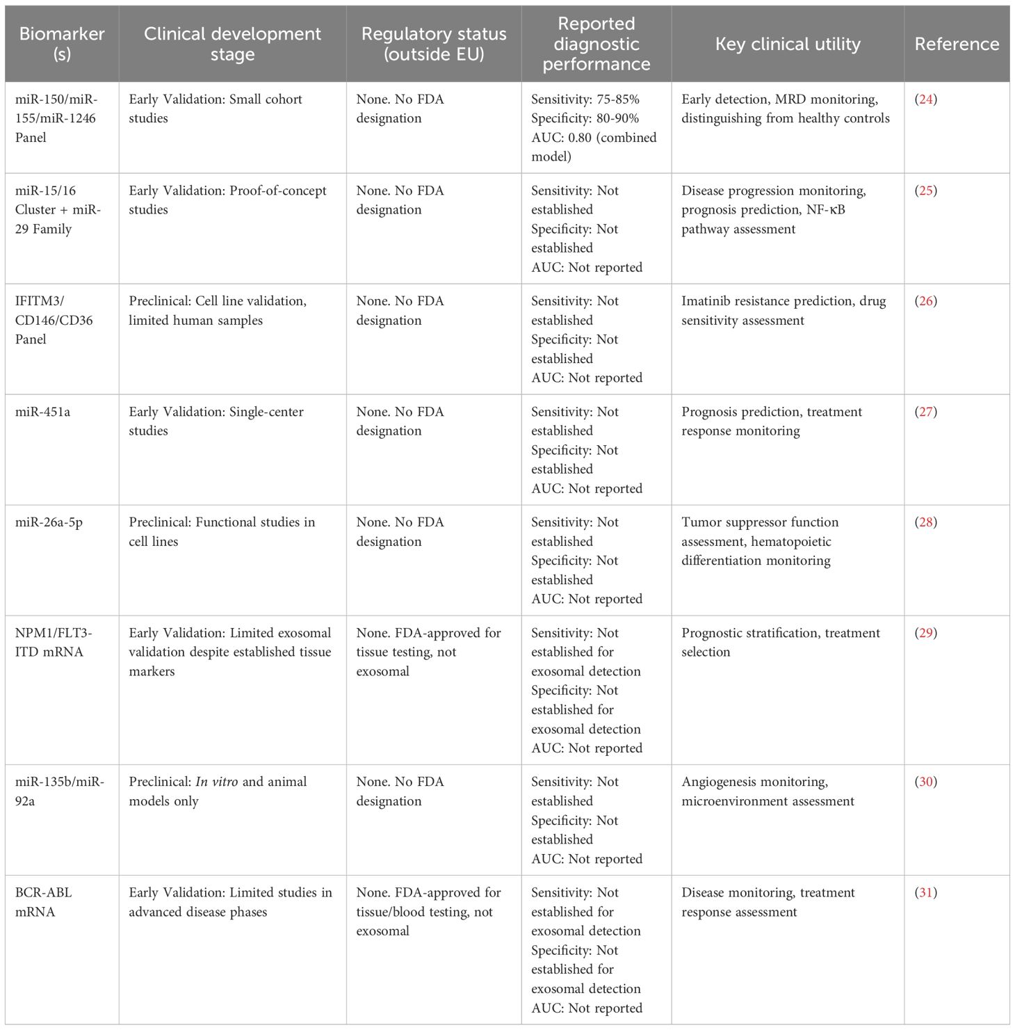 Table 2. Comparative clinical development status and performance of exosomal biomarkers in leukemia.