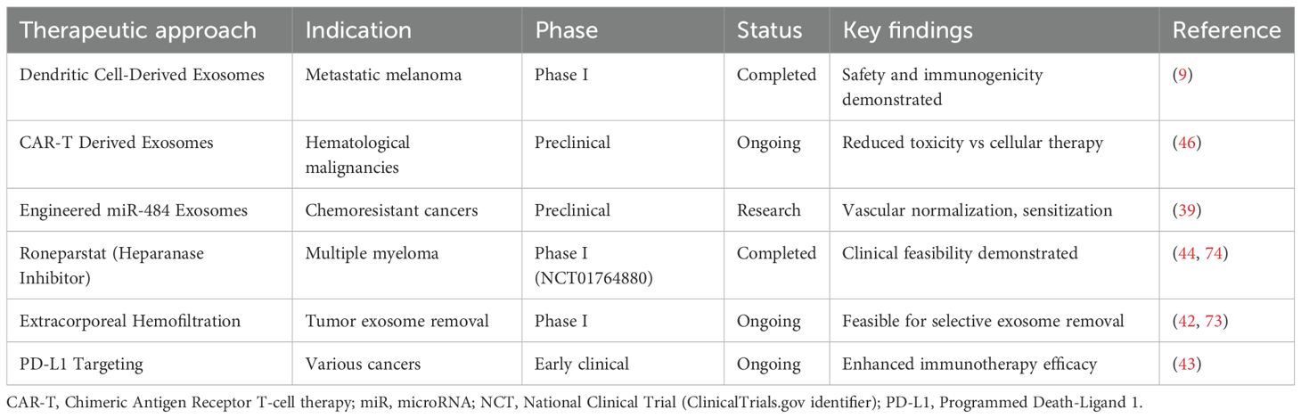 The integration of exosome-targeting strategies with existing therapies represents a promising clinical translation pathway. Combination approaches that simultaneously block both cell-surface and exosome-derived PD-L1 are being evaluated in clinical trials, with preliminary evidence suggesting enhanced immunotherapy efficacy through dual targeting mechanisms (52). The NCT01764880 trial demonstrated the clinical feasibility and safety of Roneparstat, a heparanase inhibitor, in patients with multiple myeloma. While preclinical evidence suggests heparanase inhibition can affect exosome biology, this trial was primarily focused on heparanase targeting rather than specifically proving exosome communication blockade (53). These approaches exemplify the translation of mechanistic understanding into actionable clinical strategies (Table 3).
