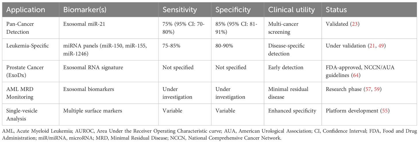 The clinical implementation of these biomarkers has been facilitated by the development of standardized analytical platforms that provide reproducible results across different healthcare settings. The ExoDx Prostate Test, a clinically validated exosome-based diagnostic, has been included in both NCCN and AUA guidelines for prostate cancer early detection, establishing precedent for exosome-based liquid biopsy applications that are now being actively investigated in hematological malignancies (61). This precedent provides a regulatory and clinical framework for implementing exosome-based diagnostics in leukemia, with similar sensitivity and specificity requirements for clinical validation (Figure 4, Table 4).