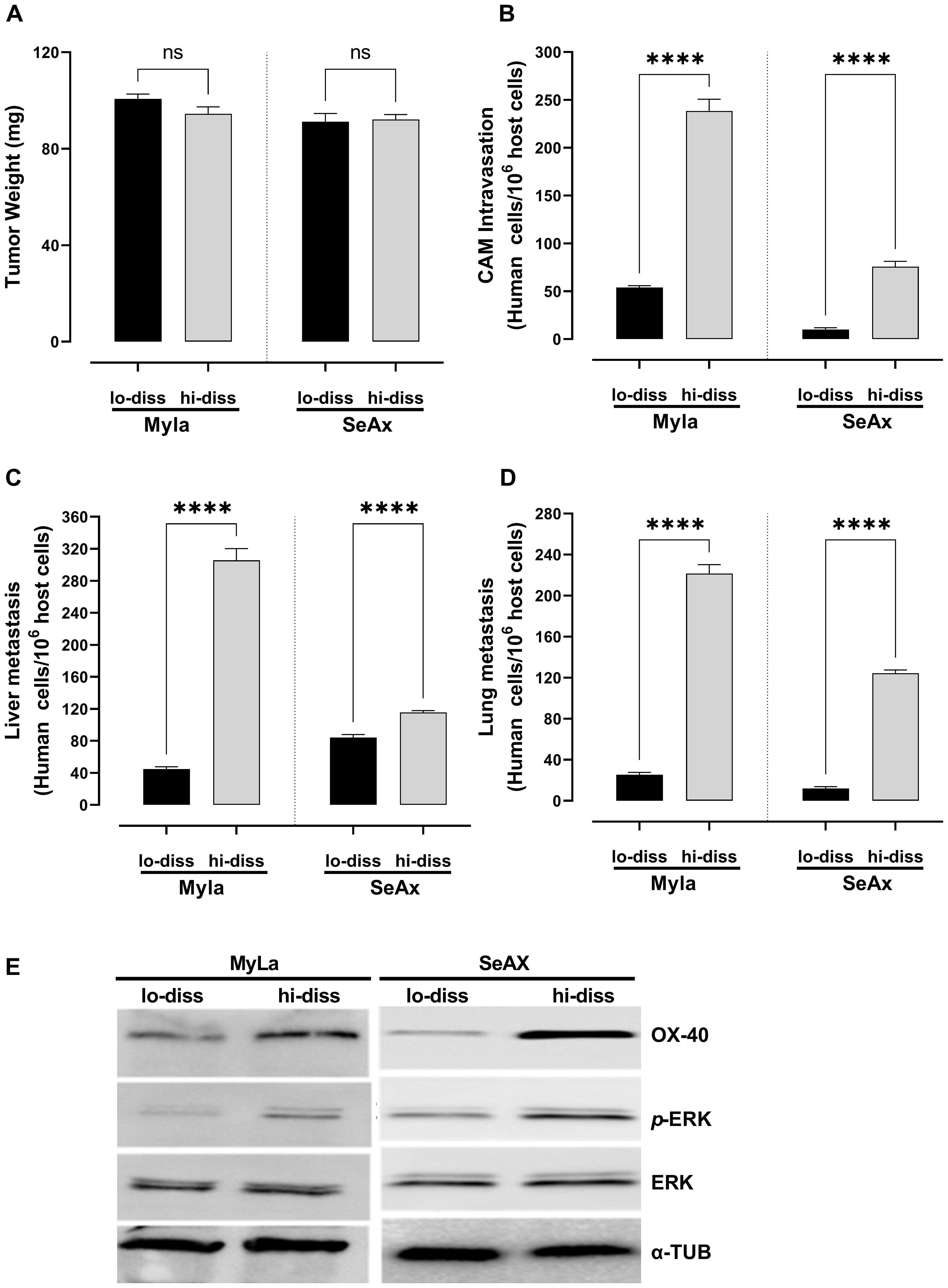 Figure 1. OX-40 expression promotes CTCL cell intravasation and colonization to distal organs. Ability of high- and low-disseminated OX-40-expressing MyLa and SeAx to affect (A) tumor weight (unpaired t-test with Welch’s correction); (B) CAM intravasation (Mann-Whitney U test); and distal metastasis (unpaired t-test with Welch’s correction) to (C) liver; and (D) lung. (E) Western Blot analysis of high- and low-disseminated cells to detect OX-40, p-ERK, and ERK (unpaired t-test with Welch’s correction). Data are presented as mean ± SEM of three independent experiments. MyLa: 18 embryos n=3 independent experiments; SeAx: 15-18 embryos, n=3 independent experiments; ****p < 0.0001; ns, not significant Hi-diss, highly disseminated; Lo-diss, low-disseminated; CAM, chorioallantoic membrane; ERK, extracellular signal-regulated kinase; tub, tubulin.