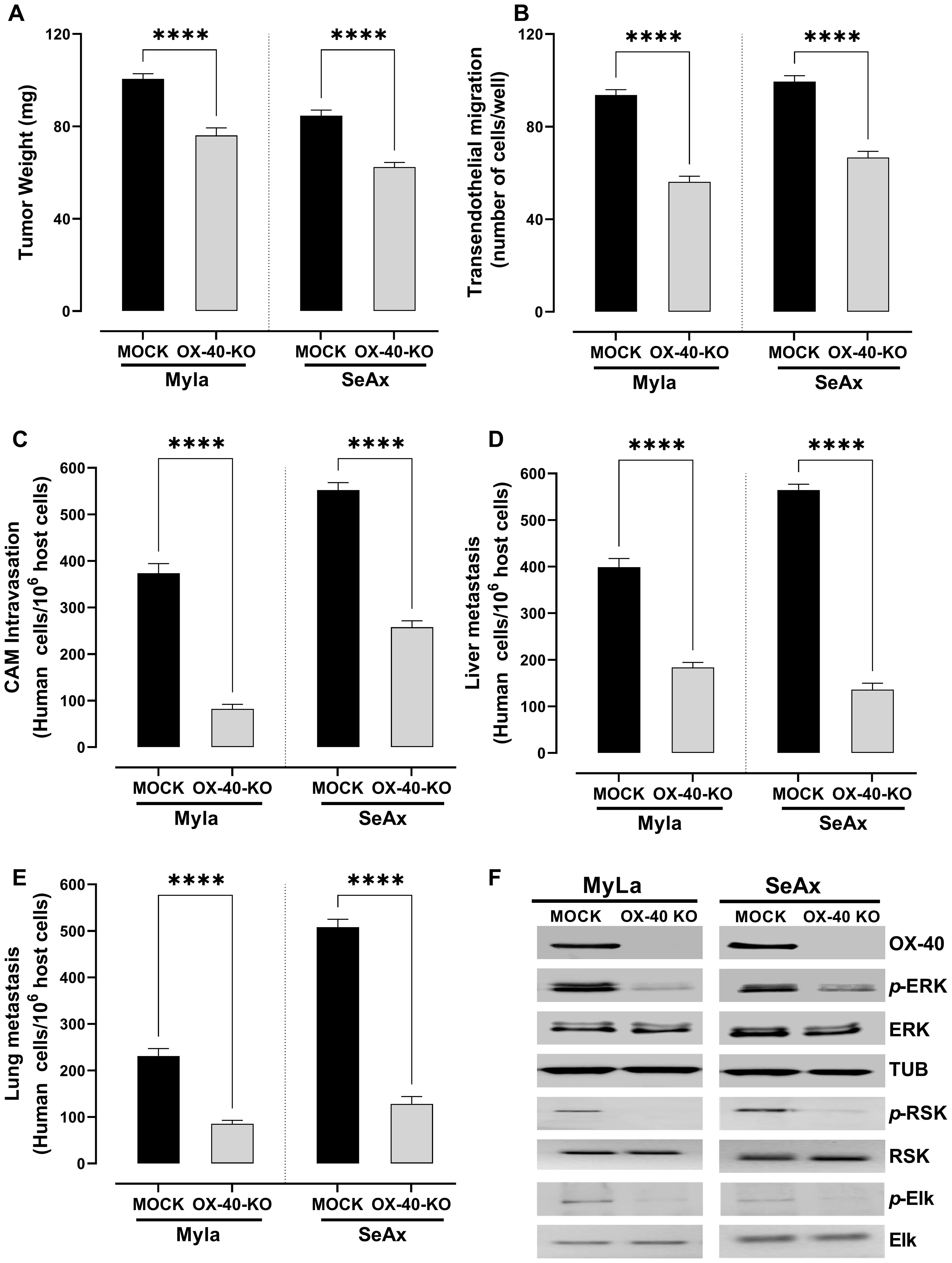 Figure 2. Loss of OX-40 reduces tumor weight, transendothelial migration, CAM intravasation, and distal metastasis through inhibition of the ERK1/2 signaling pathway. OX-40 KO MyLa and SeAx cells engrafted in the chick embryo CAM model significantly reduced (A) tumor weight (unpaired t-test with Welch’s correction) (B) transendothelial migration (unpaired t-test with Welch’s correction) (C) CAM intravasation (Mann-Whitney U test) (D, E) distal metastasis, and (F) and reduced phosphorylation of ERK1/2, ELK and RSK in CAM-grafted CTCL tumors, as shown by Western blot analysis (unpaired t-test with Welch’s correction). Data are presented as mean ± SEM of three independent experiments. MyLa: 11-12 embryos, n=3 independent experiments; SeAx: 16 embryos, n=3 independent experiments; ****p < 0.0001; ns, not significant [unpaired t-test with Welch’s correction or Mann-Whitney U test (tumor weight)]. KO, knockout; CAM, chorioallantoic membrane; ERK, extracellular signal-regulated kinase; tub, tubulin.