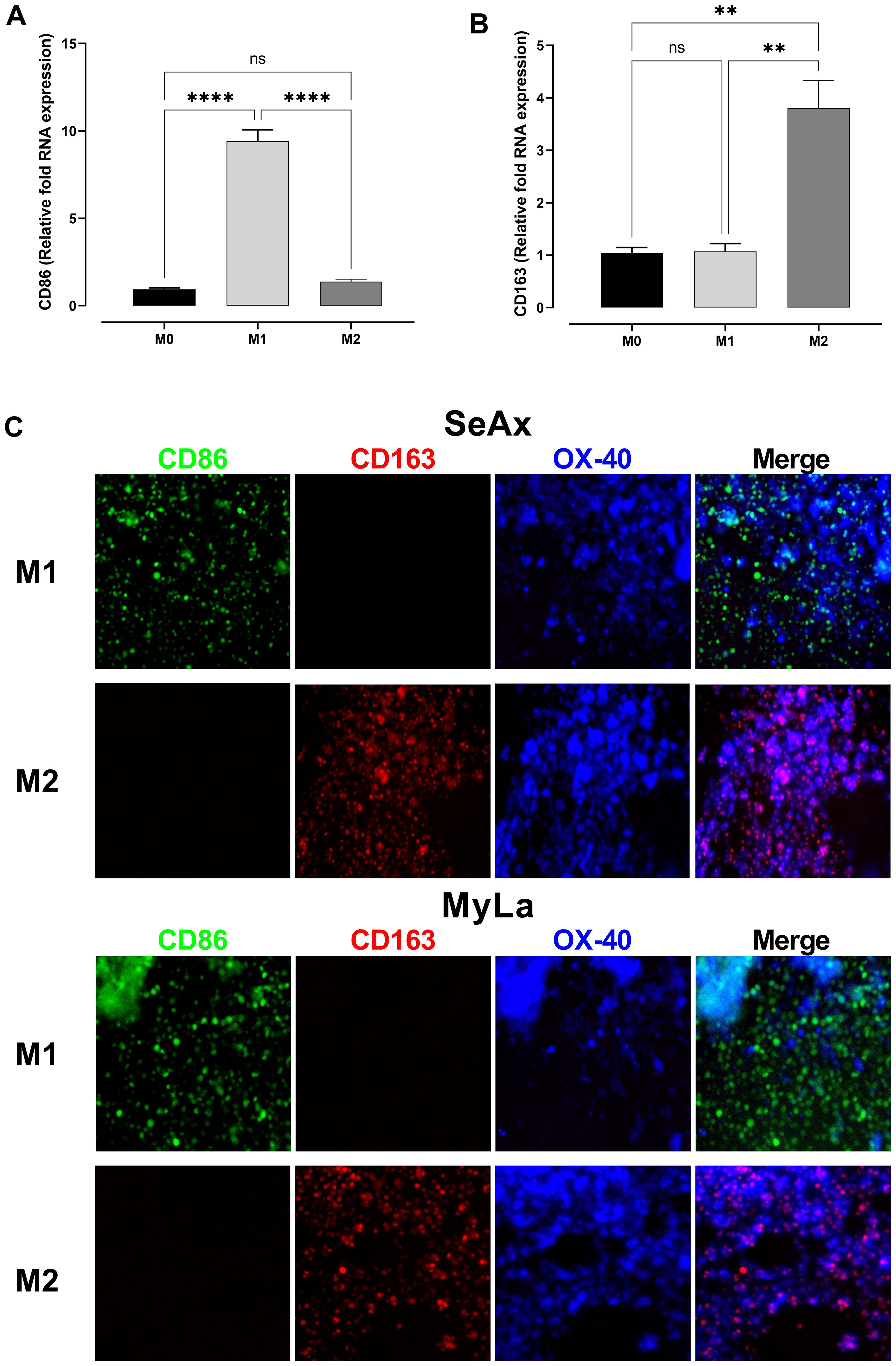Figure 3. Confirmation of macrophage polarization and the involvement of M2 macrophages in OX-40 KO tumor development. Comparative RNA levels of polarization markers in monocytes: CD86 M1 (A) and CD163 M2 (B). Immunofluorescence stain on frozen tumor sections of SeAx/MyLa xenografts demonstrating the existence of the CD86 + (M1) and CD163 + (M2) macrophages in the tumor microenvironment (C). Data are presented as mean ± SEM of three independent experiments. MyLa: 8-12 embryos, n=3 independent experiments; SeAx: 16 embryos, n=3 independent experiments; ****p < 0.0001; **p<0.01; ns, not significant.