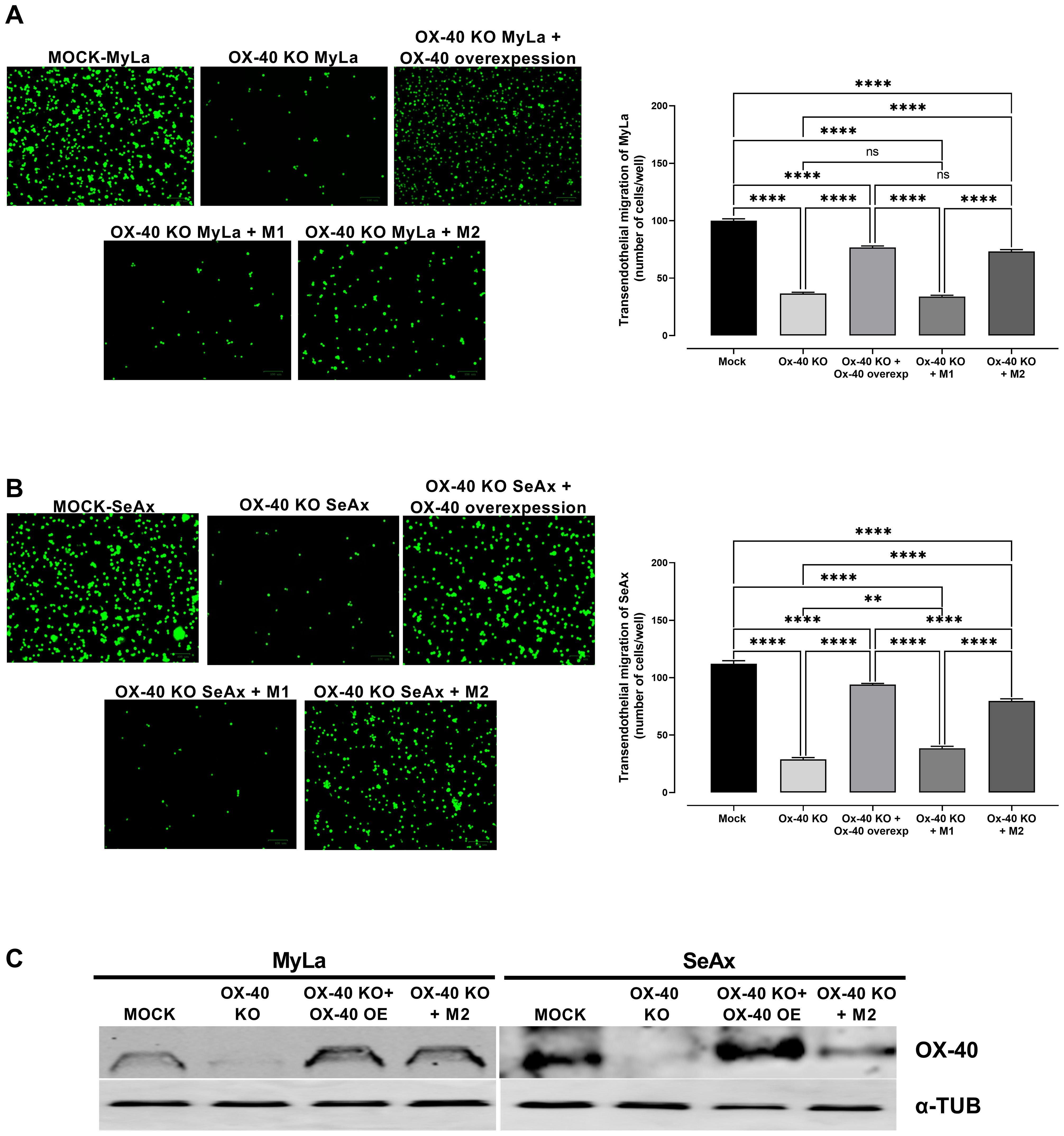 Figure 4. The effect of loss of OX-40 on MyLa cells and SeAx in transendothelial migration in the presence or absence of macrophages. Representative fluorescence images of (A) co-cultures of OX-40 KO MyLa cells with HVEC endothelial cells and M1 and M2 macrophages (B) co-cultures of OX-40 KO SeAx cells with HVEC endothelial cells and M1 and M2 macrophages (C) Western Blot analysis of co-cultures for the detection of OX-40. Data are presented as mean ± SEM of three independent experiments. MyLa: 15 embryos n=3 independent experiments; SeAx: 16 embryos, n=3 independent experiments; **p < 0.01, ****p < 0.0001; ns: not significant (Brown-Forsythe and Welch ANOVA tests with Dunnett’s T3 multiple comparison test). KO, knockout; OE, overexpression; M, macrophages.