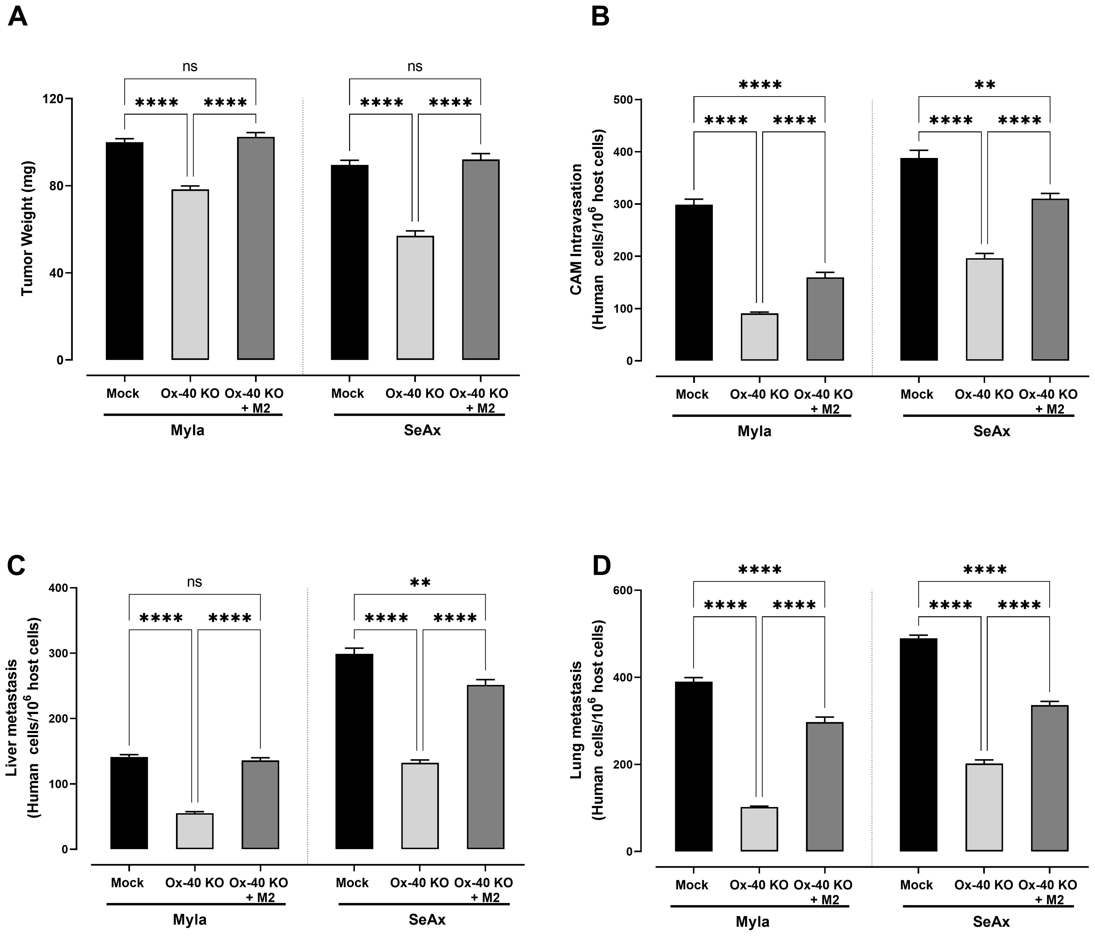 Figure 5. The effect of loss of OX-40 on CTCL cells in tumor weight, CAM intravasation and distal metastasis in the presence and/or absence of macrophages. OX-40 KO CTCL cells significantly reduced (A) tumor weight (unpaired t-test with Welch’s correction) (B) transendothelial migration (unpaired t-test with Welch’s correction) (C) CAM intravasation (Mann-Whitney U test) (D) distal metastasis and these effect were restored in the presence of M2 macrophages. Data are presented as mean ± SEM of three independent experiments. MyLa: 15-16 embryos n=3 independent experiments; SeAx: 16 embryos, n=3 independent experiments; **p < 0.01, ****p<0.0001; ns: not significant (Brown-Forsythe and Welch ANOVA tests with Dunnett’s T3 multiple comparison test). KO, knockout; OE, overexpression; M, macrophages.