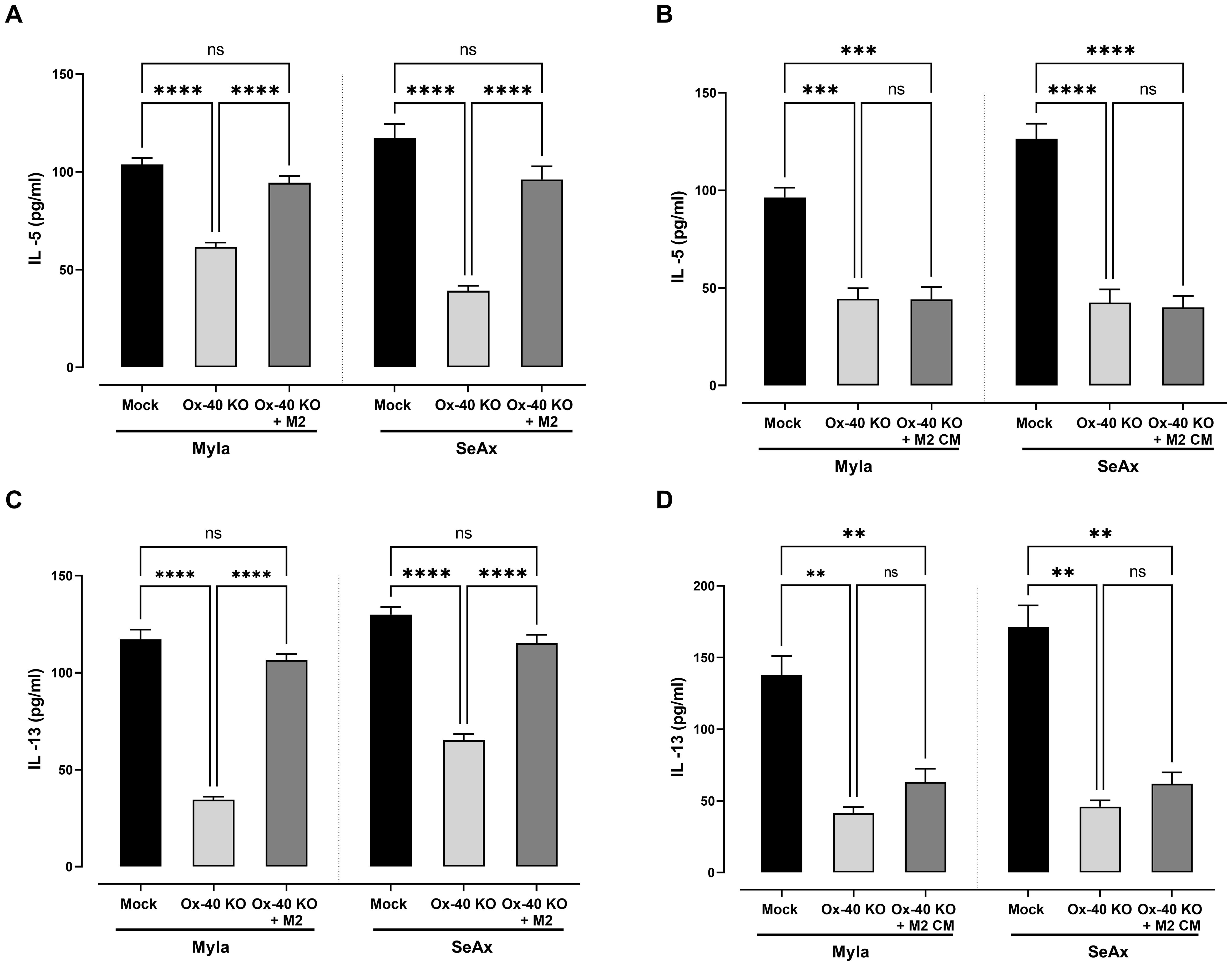 Figure 6. M2-Macrophages Restore Th2 Cytokine Expression in OX-40 KO CTCL cells. Decrease in (A) IL-5 and (C) IL-13 in OX-40 KO CTCL cells was restored in the presence of M2 macrophages but not in CM experiments (B, D). Data are presented as mean ± SEM of three independent experiments. MyLa: 9 embryos, n=3 independent experiments; SeAx: 9 embryos, n=3 independent experiments; ****p<0.0001; ** p<0.01; ns: not significant (Brown-Forsythe and Welch ANOVA tests with Dunnett’s T3 multiple comparison test). KO, knockout; M, macrophage.