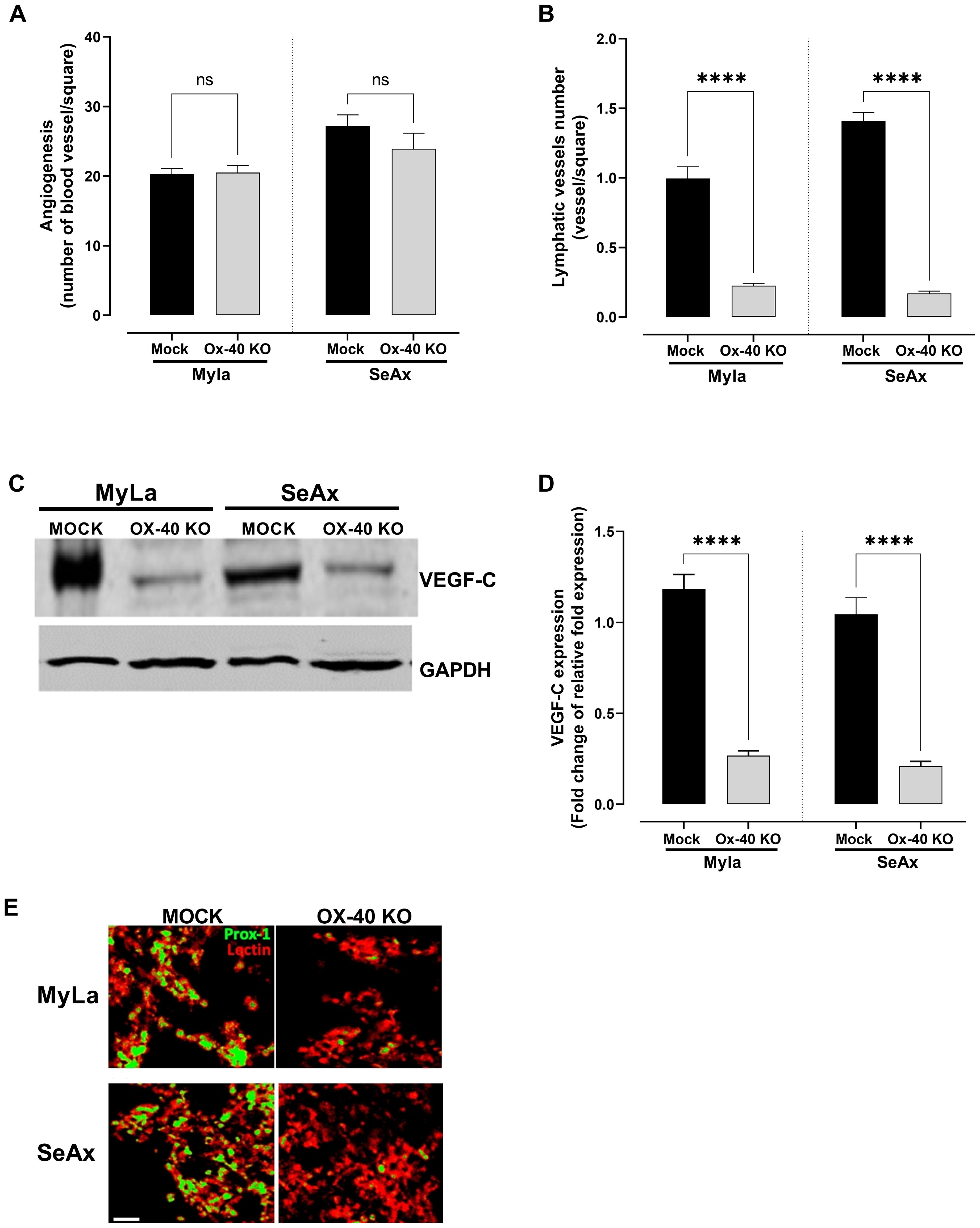 Figure 7. The effect of OX-40 on CTCL cells in angiogenesis and lymphangiogenesis. Measurement of (A) blood (unpaired t-test with Welch’s correction); and (B) lymphatic vessel formation (Mann-Whitney U test). VEGF-C expression by (C) Western blotting (unpaired t-test with Welch’s correction), and (D) RT-PCR (unpaired t-test with Welch’s correction). (E) Immunofluorescence staining of angiogenesis and lymphangiogenesis in CTCL tumors using the chick embryo CAM model (unpaired t-test with Welch’s correction). Images show blood vessels stained with lectin-Texas red and lymphatic vessels stained with anti-Prox1-FITC. Scale bars = 50 and 100 μm. Data are presented as mean ± SEM of two independent experiments. Angiogenesis MyLa: 10 embryos n=2 independent experiments; Angiogenesis SeAx: 9 embryos, n=2 independent experiments; Lymphatic vessel formation MyLa: 11 embryos, n=2 independent experiments; Lymphatic vessel formation SeAx: 9 embryos, n=2 independent experiments; RT-qPCR – 10 embryos in n=2 independent experiments; ns: not significant, ****p<0.0001; ns: not significant. KO, knockout; CAM, chorioallantoic membrane; VEGF, vascular endothelial growth factor.