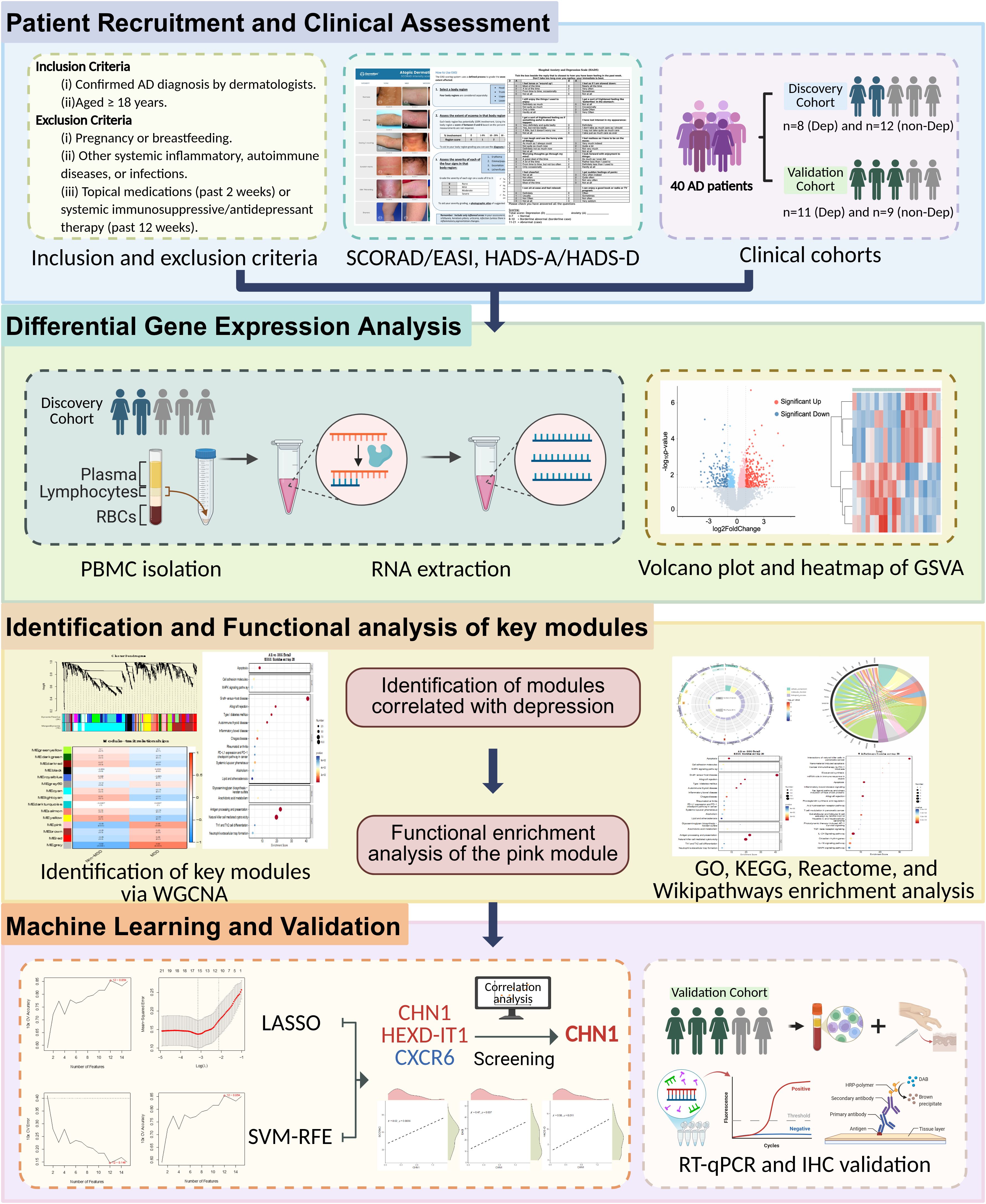 Despite these advances, several limitations requiring consideration. The modest size of the validation cohort may restrict the statistical power, increase the risk of overfitting and biological uncertainty, common challenges in small-sample WGCNA analysis and machine-learning analyses that can generate overly optimistic performance estimates. Also, age and SCORAD/EASI scores were not modeled as continuous covariates in the RNA-seq analysis, which may have inflated the number of false-positive DEGs. The limitation may restrict the generalizability of our findings and the robustness of validating CHN1 as a stable biomarker, particularly given the heterogeneity of immune pathway dysregulation among different subgroups of patients with AD and depression comorbidity. Future multi-center studies with larger cohorts are therefore needed to validate the reliability of CHN1 and refine its clinical applicability. Additionally, mechanistic studies should further elucidate the pathways underlying f neuropsychiatric comorbidities in AD, ultimately guiding targeted therapeutic strategies to improve the mental-health outcomes in AD populations.