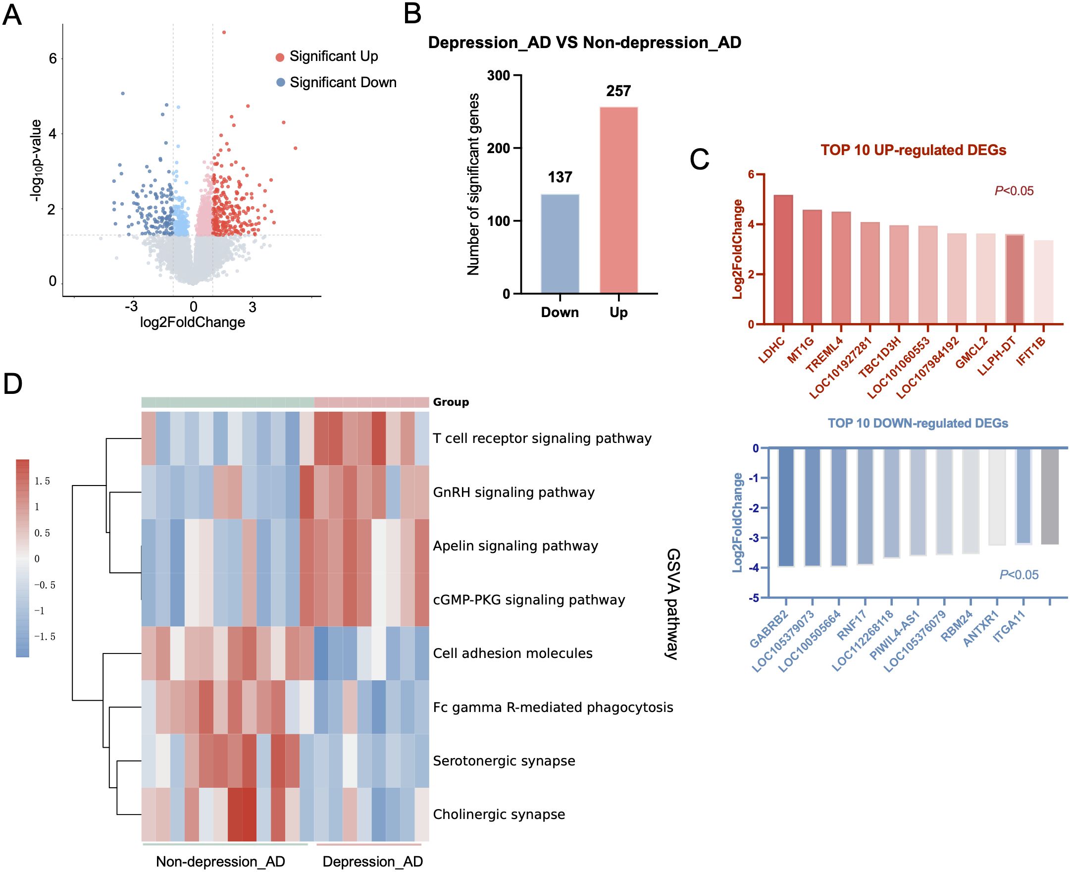 Figure 2. Baseline gene expression analysis in AD patients with and without depression. (A) Volcano plot showing DEGs in depressed AD patients compared with non-depressed counterparts. Blue dots represent downregulated genes and red plots represent upregulated genes. (B) Bar chart showing the number of down- and up-regulated DEGs in AD patients with depression. (C) Top 10 up- and down-regulated DEGs ranked by fold change and Log2FC (P < 0.05). (D) Heatmap displaying GSVA enrichment analysis results, highlighting key pathways associated with depression in AD patients.