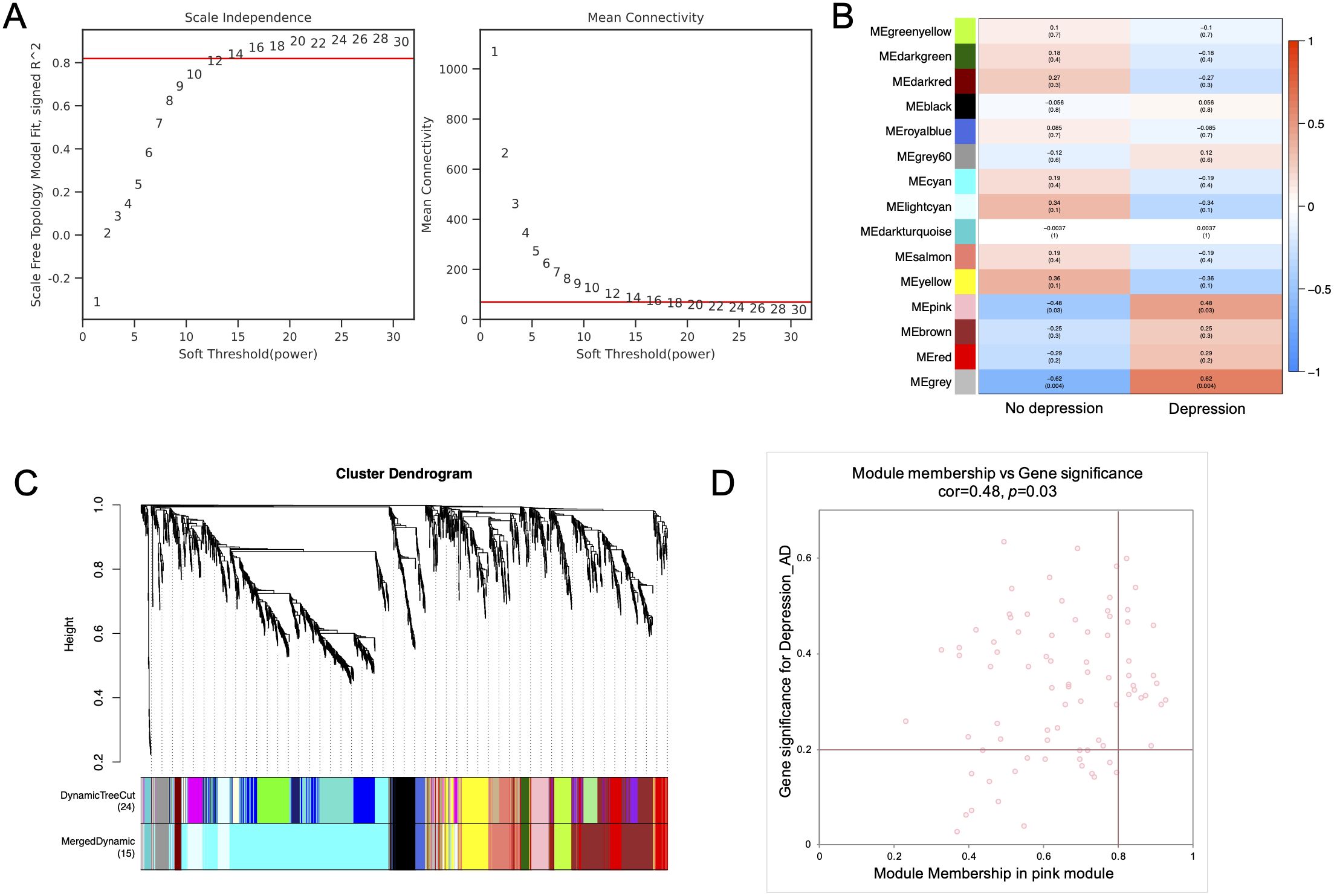 Figure 3. Identification of modules highly correlated with depression in AD patients. (A) Topology analysis and mean connectivity assessment across a range of soft threshold powers. (B) Heatmap illustrating the relevance of various modules with depression. (C) Dendrogram of module clustering, with distinct module colors representing different gene module. (D) The pink module was identified as the module most significantly correlated with depression in AD. The scatter plot presenting the correlation between module membership and gene significance within the module.