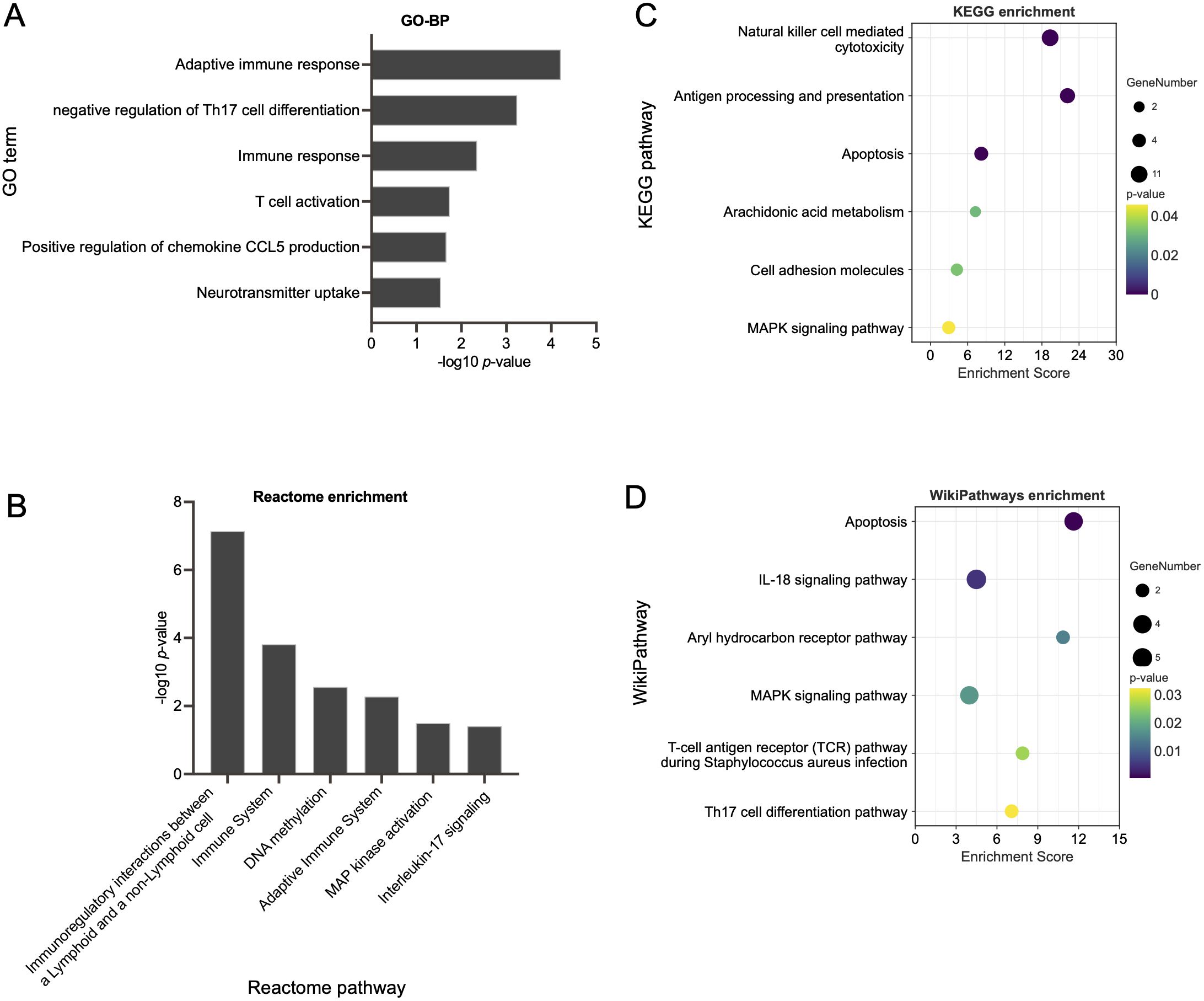 Functional enrichment analysis within the pink module uncovered the biological roles of DEGs, which most reflected the key signaling pathways activated in AD patients with depression. GO analysis revealed associations with neural and immune pathways, including adaptive immune response, negative regulation of Th17 cell differentiation, T cell activation, positive regulation of chemokine CCL5 production and neurotransmitter uptake (Figure 4A). KEGG enrichment analysis highlighted pathways such as antigen processing and presentation, natural killer cell-mediated cytotoxicity, apoptosis, arachidonic acid metabolism, and the MAPK signaling pathway (Figure 4B). Reactome pathway analysis showed enrichment in immune system interactions, immunoregulatory interactions between a lymphoid and a non-lymphoid cell, IL-17 signaling, etc. (Figure 4C). WikiPathways analysis emphasized high enrichment scores in IL-18 signaling pathway, aryl hydrocarbon receptor pathway, T-cell antigen receptor pathway during staphylococcus aureus infection, and Th17 cell differentiation pathway (Figure 4D).