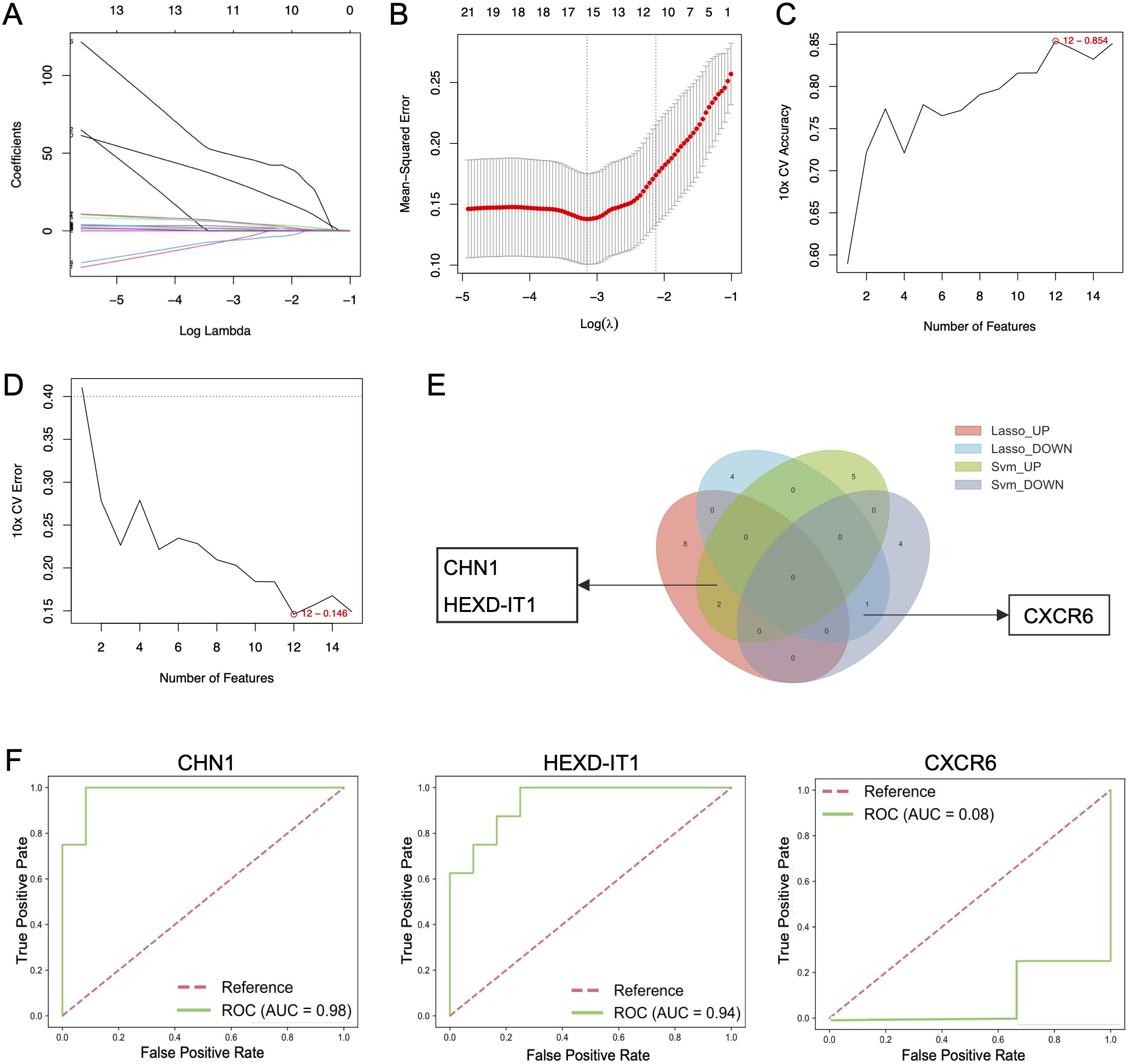 Key genes were identified using LASSO regression analysis and SVM-RFE algorithms. Through the rigorous process of LASSO analysis (10-fold CV, mean AUC = 0.81 ± 0.3), 15 feature genes (10 up-regulated and 5 down-regulated) were yielded (Figures 5A, B), while SVM-RFE (10-fold CV, AUC = 0.75 ± 0.17) identified 12 genes (7 upregulated and 5 down-regulated) (Figures 5C, D). The Venn diagram revealed the overlap of key genes identified by the two machine learning methods discussed above (Figure 5E). From the pool of identified genes, CHN1 and HEXD-IT1 emerged as upregulated in AD patients with comorbid depression, whereas CXCR6 was pinpointed as a downregulated gene. ROC analysis illustrated revealed that CHN1 and HEXD-IT1 exhibited high AUC values (> 0.8), indicating a strong association of these two genes with AD-related depression (Figure 5F).