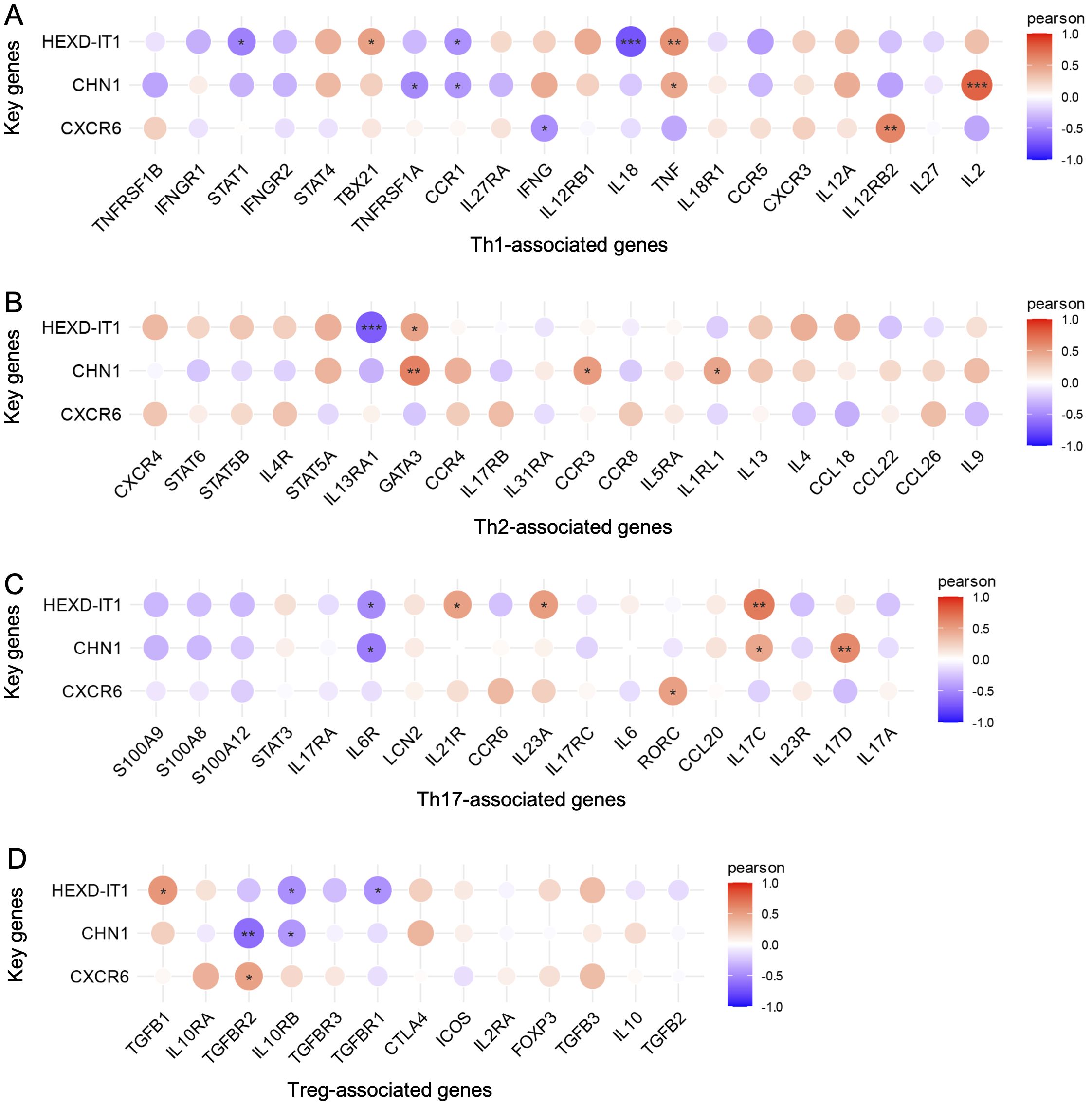 Figure 6. Relationship between immune-related active molecules and key genes. Correlation analysis of key genes with members of the (A) Th1, (B) Th2, (C) Th17, and (D) Treg family members. *p < 0.05, *p < 0.01, **p < 0.01, ***p < 0.001.