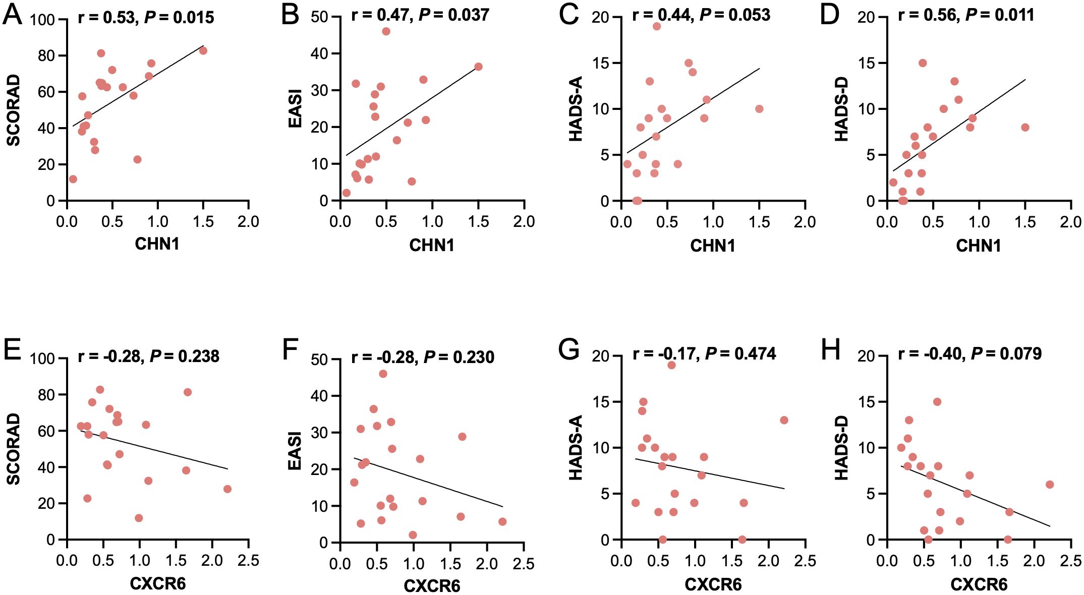 Figure 7. Correlation between CHN1 and CXCR6 expression and clinical characteristics. Pearson correlation analysis of CHN1 mRNA expression levels with clinical characteristics, including (A) SCORAD, (B) EASI, (C) HADS-A, and (D) HADS-D. Correlation of CXCR6 mRNA expression levels with (E) SCORAD, (F) EASI, (G) HADS-A, and (H) HADS-D.
