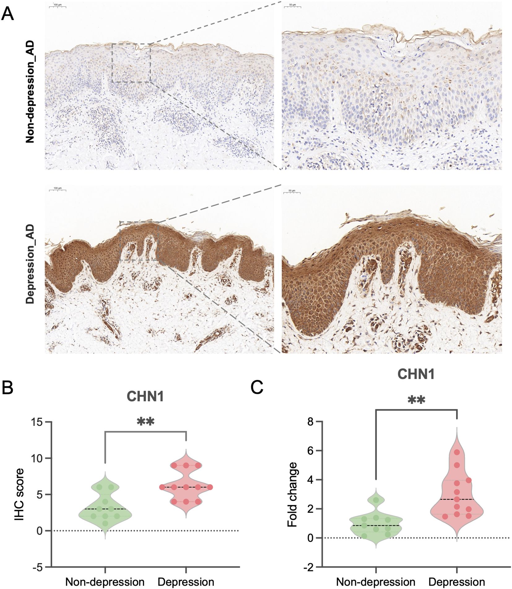 Figure 8. Verification of CHN1 expression in clinical samples. (A) IHC staining showing representative CHN1 expression in skin lesions of AD patients. (B) Histograms showing IHC scores of CHN1 expression in AD patients with depression (N = 11) and without depression (N = 9). (C) qPCR analysis of CHN1 mRNA expression levels in PBMCs from AD patients with (N = 11) and without depression (N = 9). **p < 0.01.