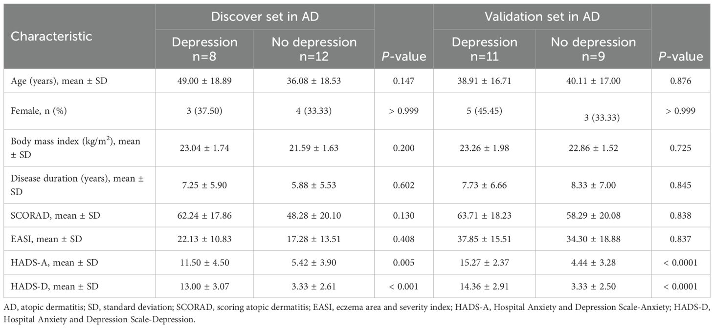 The study enrolled 40 adult patients diagnosed with AD at Wuhan Union Hospital. The inclusion criteria were: (i) a confirmed diagnosis of AD, established by dermatologists according to the guidelines of the American Academy of Allergy, Asthma and Immunology (27), and (ii) being 18 years of age or older. The exclusion criteria included: (i) pregnancy or breastfeeding; (ii) the presence of other known systemic inflammatory diseases, autoimmune disorders, or infections; and (iii) the use of any topical medications within the previous 2 weeks or systemic immunosuppressive or antidepressant therapy within the previous 12 weeks. Among the participants, 19 met the diagnostic criteria for depressive disorder, based on the psychiatrists’ application using the Fifth Edition of the Diagnostic and Statistical Manual of Mental Disorders (DSM-5), detailed in Supplementary Table 1 (28). All participants provided written informed consent. The study was approved by the Ethics Committee of Wuhan Union Hospital (protocol No. UHCT240584), and conducted in accordance with the Declaration of Helsinki.