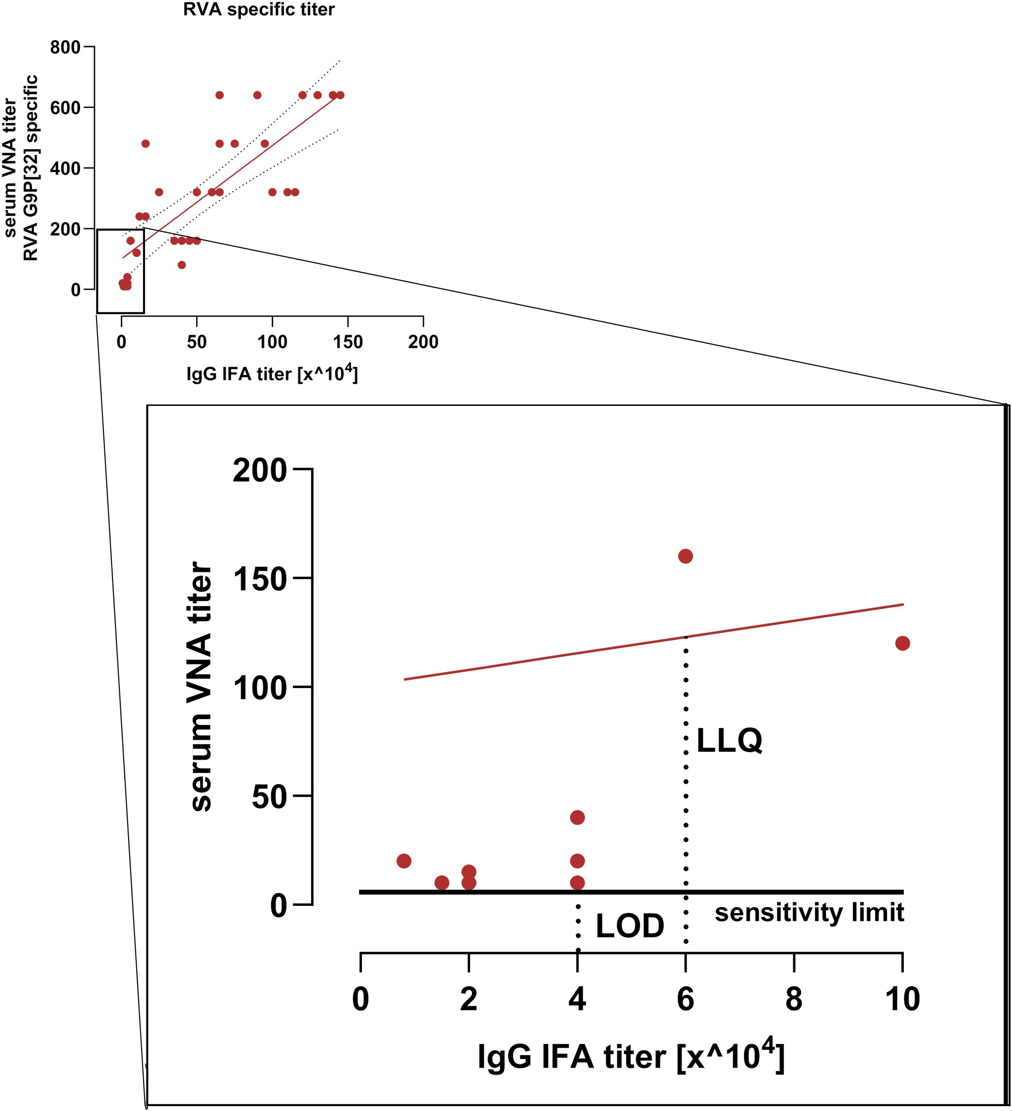 Figure 4. Sensitivity limit and linear range of the serum VNA. Shown is the correlation between RVA-specific IgG IFA titers and VNA titers from the immunization study. The low-titer range is enlarged. The limit of detection (LOD) corresponds to a RVA-specific IgG IFA titer of 40,000. The lower limit of quantification (LLQ) corresponds to a RVA-specific IgG IFA titer of 60.000. The red line indicates the VNA regression line.