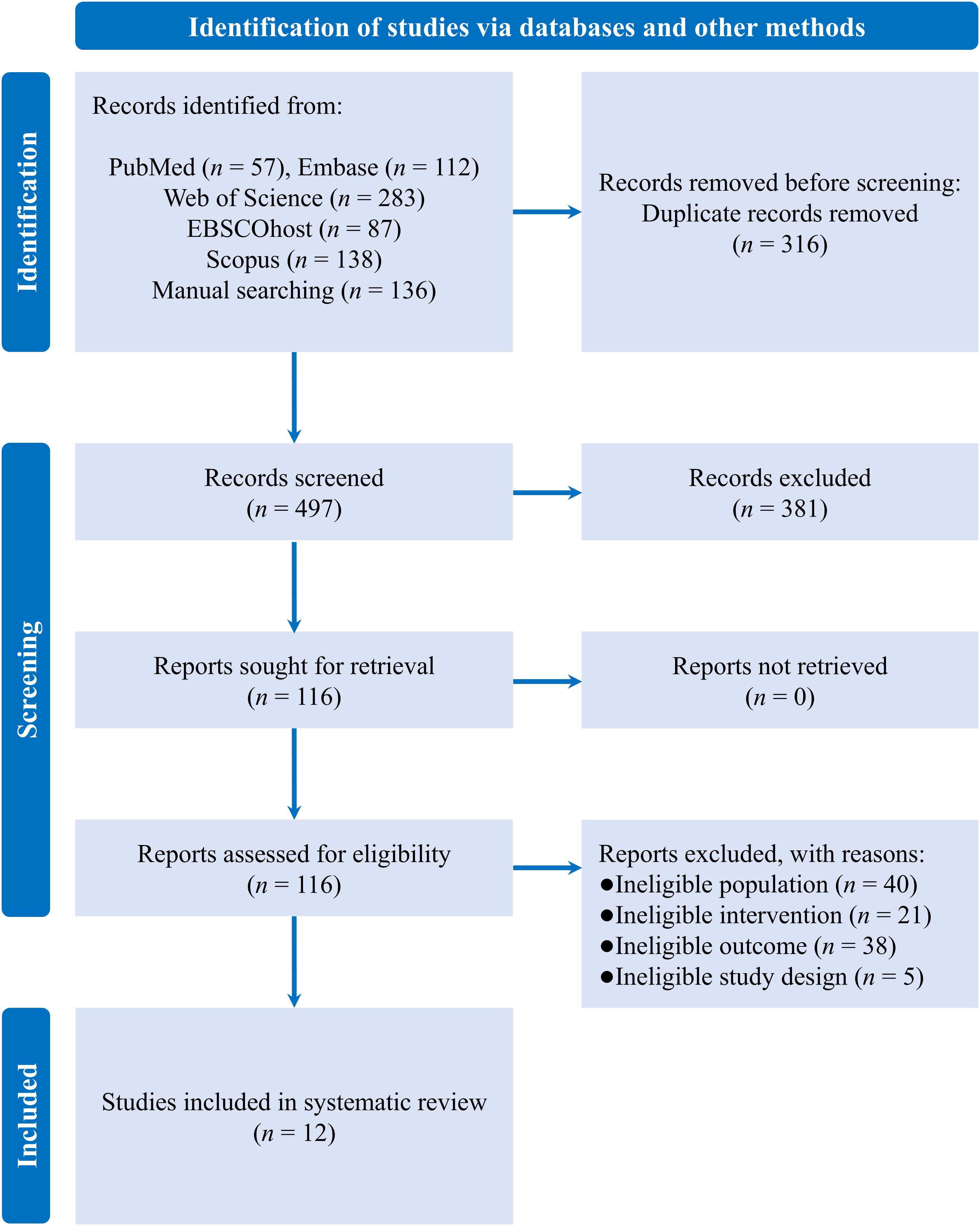 A literature search of various databases yielded a total of 813 records, of which 316 were duplicates. After screening the remaining records, 12 eligible RCTs were included in the systematic review (see Figure 1) (31–42).