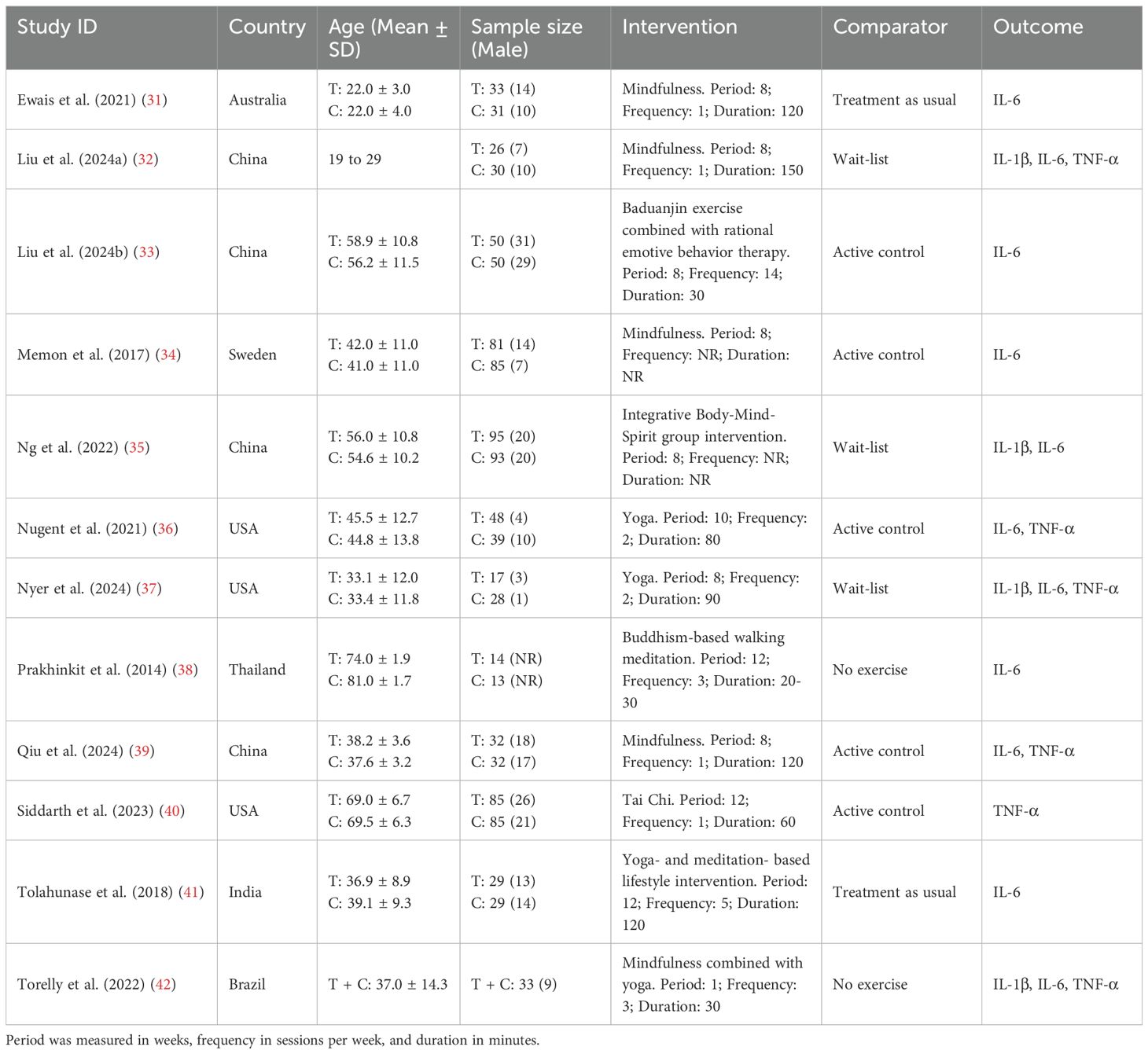 The inclusion and exclusion criteria for this systematic review strictly followed the Population, Intervention, Comparator, Outcome, and Study design (PICOS) framework. Regarding the inclusion criteria, the population was restricted to patients with depression (age ≥ 18 years); the intervention was limited to MBTs; the comparator included both non-active controls (e.g., no exercise, wait-list) and active controls (e.g., treatment as usual, standard care, placebo); the outcome focused on pro-inflammatory cytokines, including IL-1β, IL-6, and TNF-α; and the study design was restricted to RCTs. Studies targeting non-depressed patients, non-MBTs, and non-RCTs were excluded. Data from the same group of subjects were only included in a single study that provided more comprehensive information.