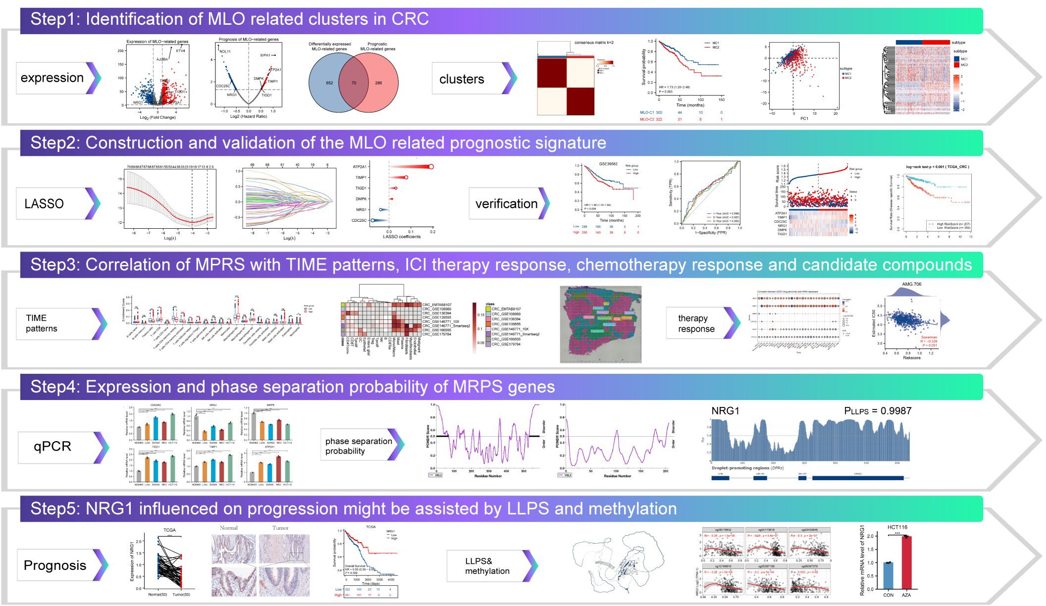 Flowchart detailing five steps in a research process: Step 1, identification of MLO-related clusters in CRC using expression and clustering analysis. Step 2, construction and validation of MLO-related prognostic signatures using LASSO and verification methods. Step 3, correlation of MPRS with TIME patterns, ICI therapy response, chemotherapy response, and candidate compounds. Step 4, analysis of expression and phase separation probability of MRPS genes through qPCR and phase separation probability assessment. Step 5, examination of NRG1 influence on progression assisted by LLPS and methylation, with emphasis on prognosis.