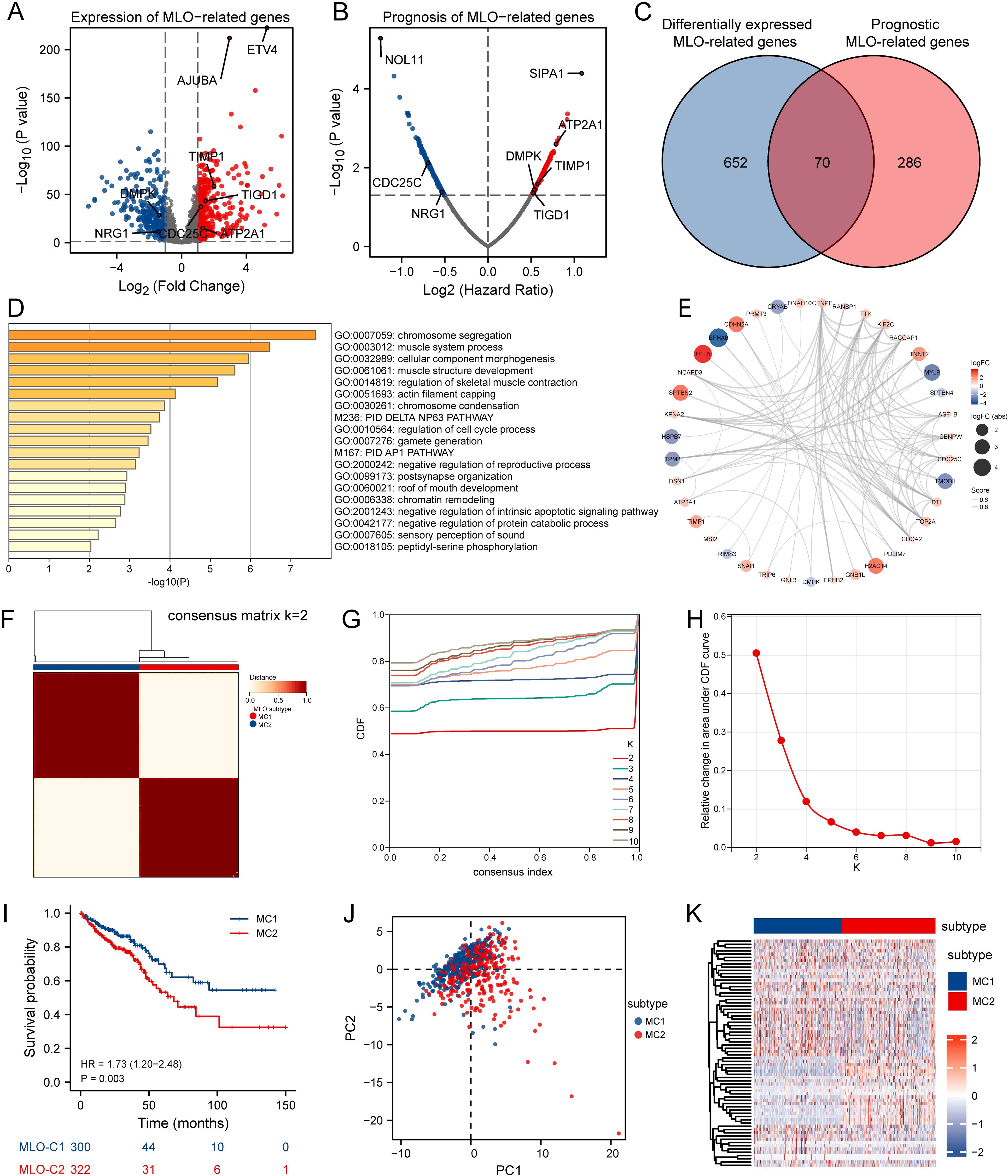 A collage of scientific graphs and charts related to MLO-related genes: A) A volcano plot showing gene expression with highlighted genes. B) A plot indicating gene prognosis using hazard ratios. C) A Venn diagram comparing differentially expressed and prognostic genes. D) A bar chart listing gene ontology terms with significance levels. E) A network graph displaying relationships between genes by log-fold change. F) A consensus matrix for k=2 clustering. G) A cumulative distribution function (CDF) plot for consensus clustering. H) A plot showing relative changes in area under the CDF curve. I) A Kaplan-Meier survival plot comparing two subtypes, MC1 and MC2. J) A principal component analysis (PCA) scatter plot of two subtypes. K) A heatmap showing gene expression patterns across subtypes.