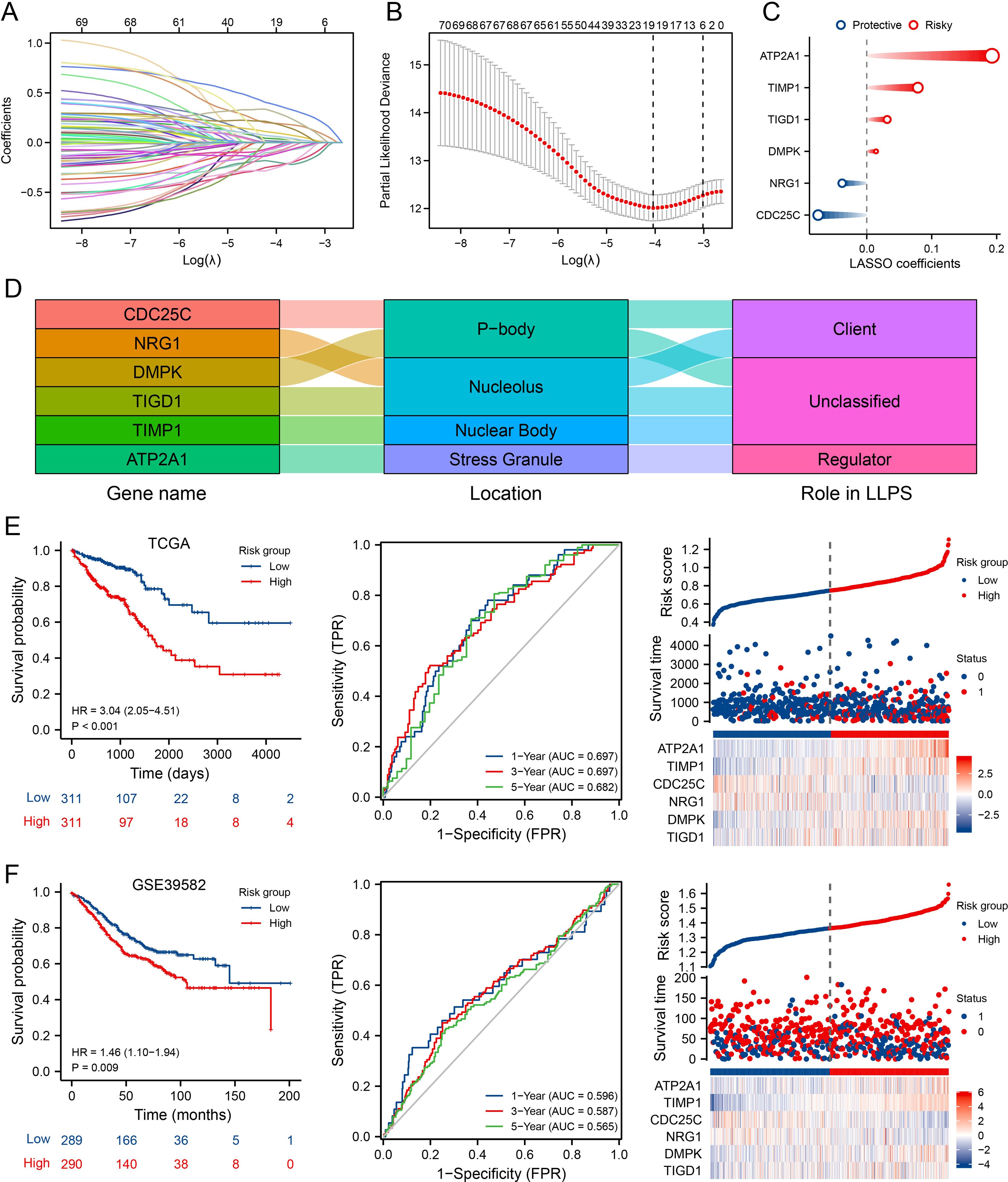 A series of visualizations analyzing gene risk scores in cancer patients. Panel A shows a plot of coefficients against log lambda values. Panel B depicts the likelihood deviance as a function of log lambda. Panel C presents a bar chart of LASSO coefficients categorizing genes as protective or risky. Panel D features a flowchart detailing gene names, their cellular locations, and roles in liquid-liquid phase separation (LLPS). Panels E and F include survival probability graphs, receiver operating characteristic (ROC) curves, and risk score heatmaps for the TCGA and GSE39582 datasets, respectively, comparing high and low-risk groups.