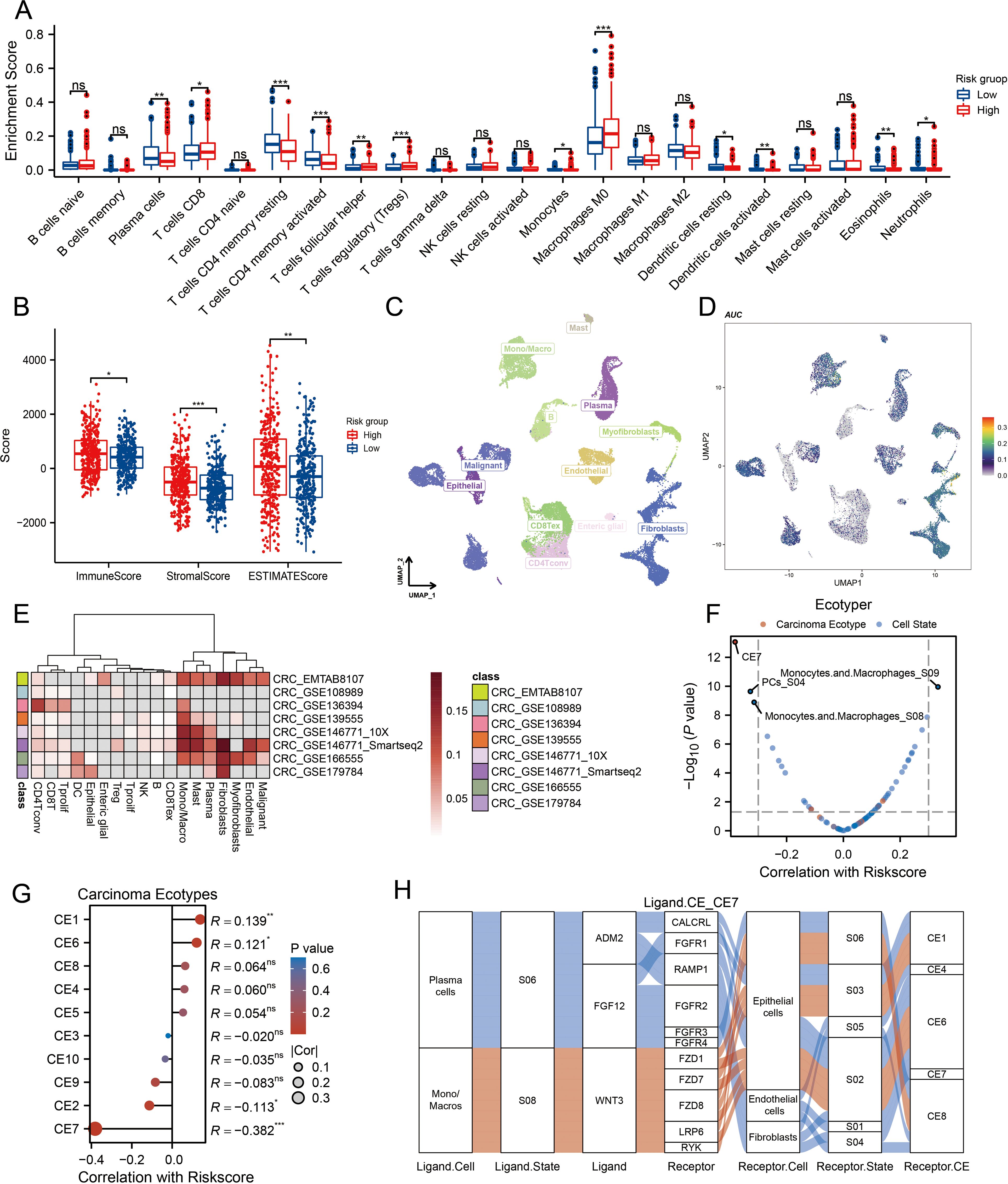 Figure 4. Association of MPRS with Immune Cell Infiltration, Single-Cell Profiles, and Ecotype Landscape in CRC. (A) Differences in the proportions of immune-infiltrating cells as determined by CIBERSORT. (B) ESTIMATE scores across subgroups. (C) A UMAP plot of single cells from CRC samples. (D) Expression of model genes in each cell type on the UMAP plot. (E) AUCell scores of different cell clusters. (F, G) Correlation between risk scores and cell ecotypes. (H) A Sankey diagram showing carcinoma ecotypes and cell states identified by the EcoTyper algorithm. Statistical two-group comparisons by Wilcoxon rank-sum (non-normal) or Student’s t (normality by Shapiro–Wilk) with Bonferroni adjustment where applicable, *p < 0.05, **p < 0.01, ***p < 0.001.