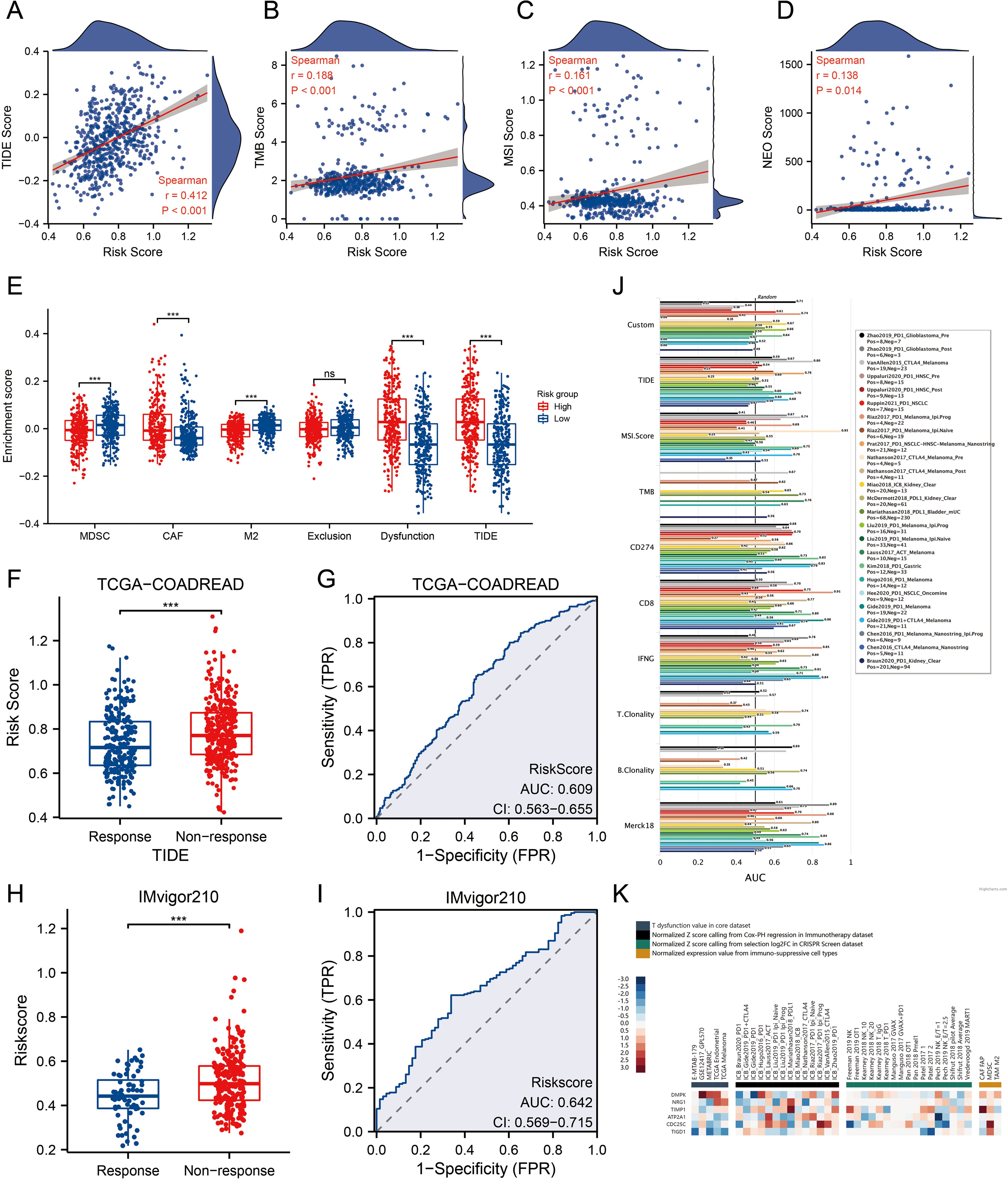 Graphs and charts display various statistical analyses related to risk scores and their correlation with different factors. Scatter plots (A-D) show Spearman correlations between risk scores and variables like TIDE, TMB, MSI, and NEO scores. Bar graphs (E and J) illustrate enrichment scores and comparative data for risk groups across multiple conditions. Box plots (F and H) depict risk scores against response status in datasets TCGA-COADREAD and IMvigor210. Line charts (G and I) provide ROC curves for the same datasets, with AUC and confidence intervals. A heat map (K) visualizes normalized expression values across conditions.