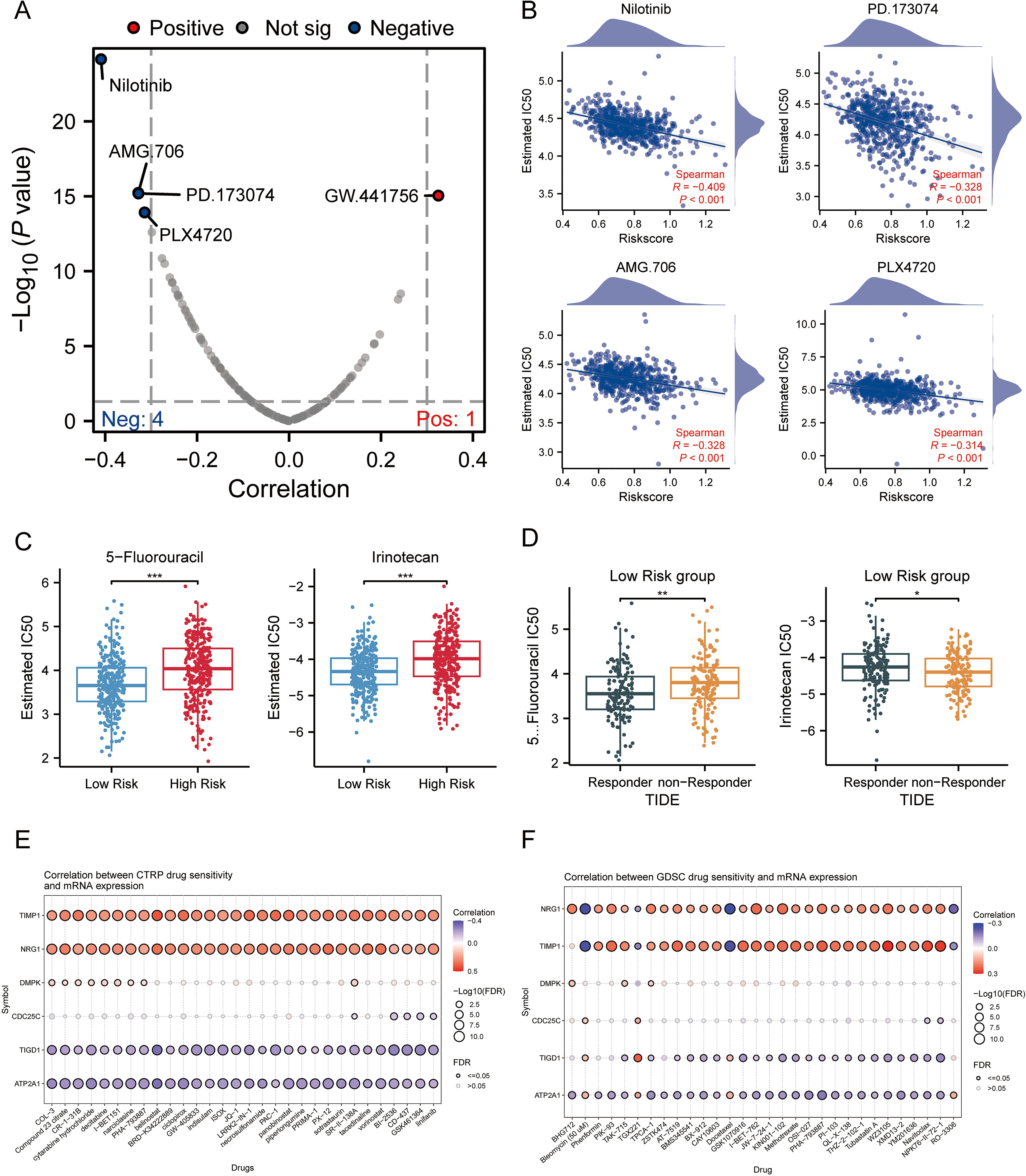 Figure 6. Association of MPRS with Chemotherapy Sensitivity and Candidate Compounds in CRC. (A) A volcano plot showing the sensitivity of CRC to chemotherapeutic drugs. (B) IC50 values of four chemotherapeutic drugs: PD.173074, Nilotinib, AMG.706, and PLX4720. (C) IC50 values of 5-fluorouracil and Irinotecan predicted by the pRRophetic algorithm in high- and low-MPRS groups. (D) Predicted IC50 values of 5-fluorouracil and Irinotecan in the low-MPRS group via the TIDE algorithm. (E, F) Drug sensitivity of selected genes based on CTRP analyses. (F) Drug sensitivity of selected genes based on GDSC analyses. Statistical two-group comparisons by Wilcoxon rank-sum (non-normal) or Student’s t (normality by Shapiro–Wilk) with Bonferroni adjustment where applicable, Spearman’s correlation with BH-FDR correction. *p < 0.05, **p < 0.01, ***p < 0.001.