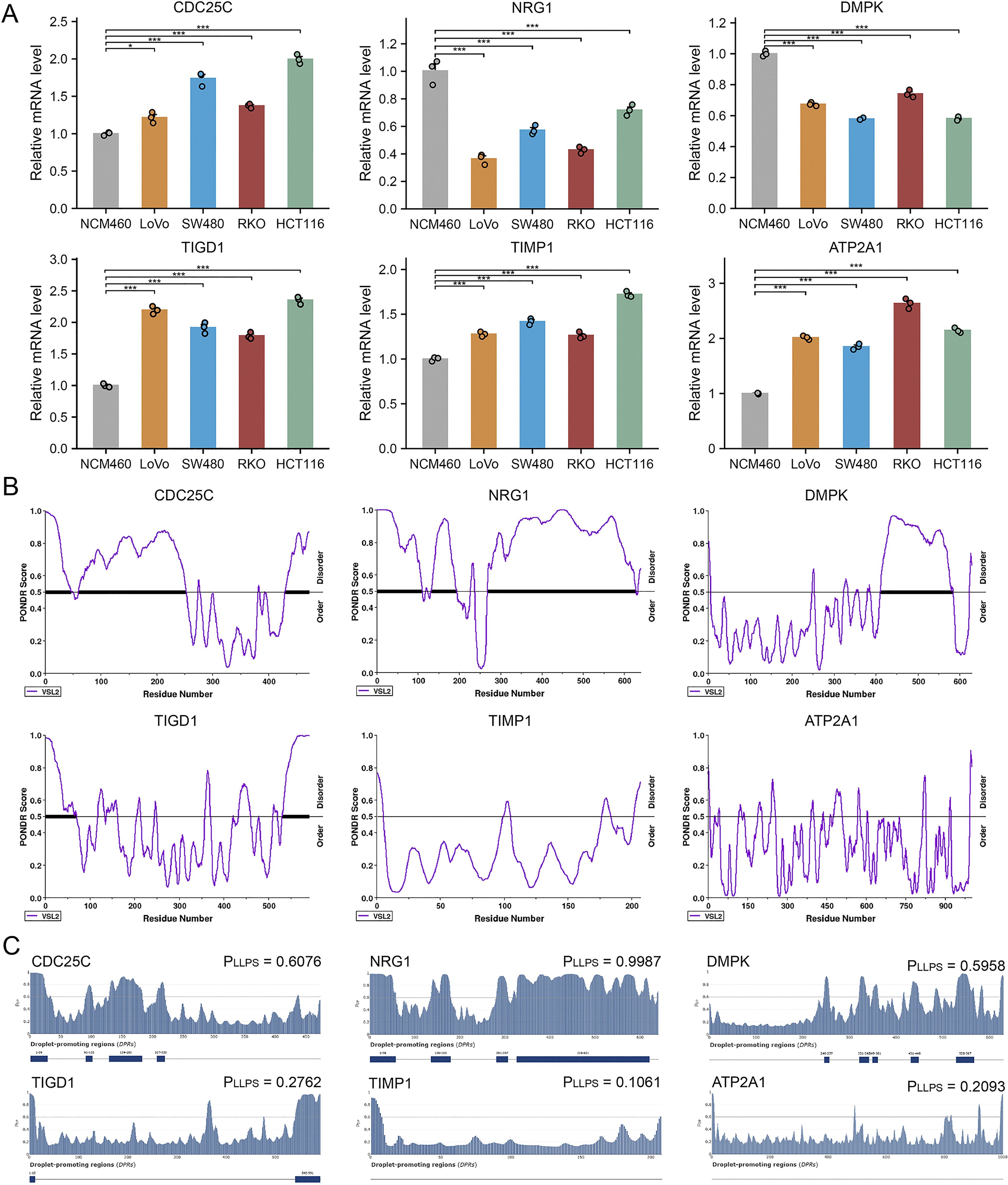 Figure 7. Expression in Cell Lines and LLPS Probability of MPRS Model Genes. (A) mRNA expression levels of model genes in normal and CRC cell lines assessed by quantitative PCR. (B) Identification of intrinsically disordered regions (IDRs) in model genes via PONDR. (C) Evaluation of phase separation potential of model genes via FuzDrop. Statistical comparisons performed using Wilcoxon or T tests with Bonferroni adjustment where applicable. *p < 0.05, **p < 0.01, ***p < 0.001.