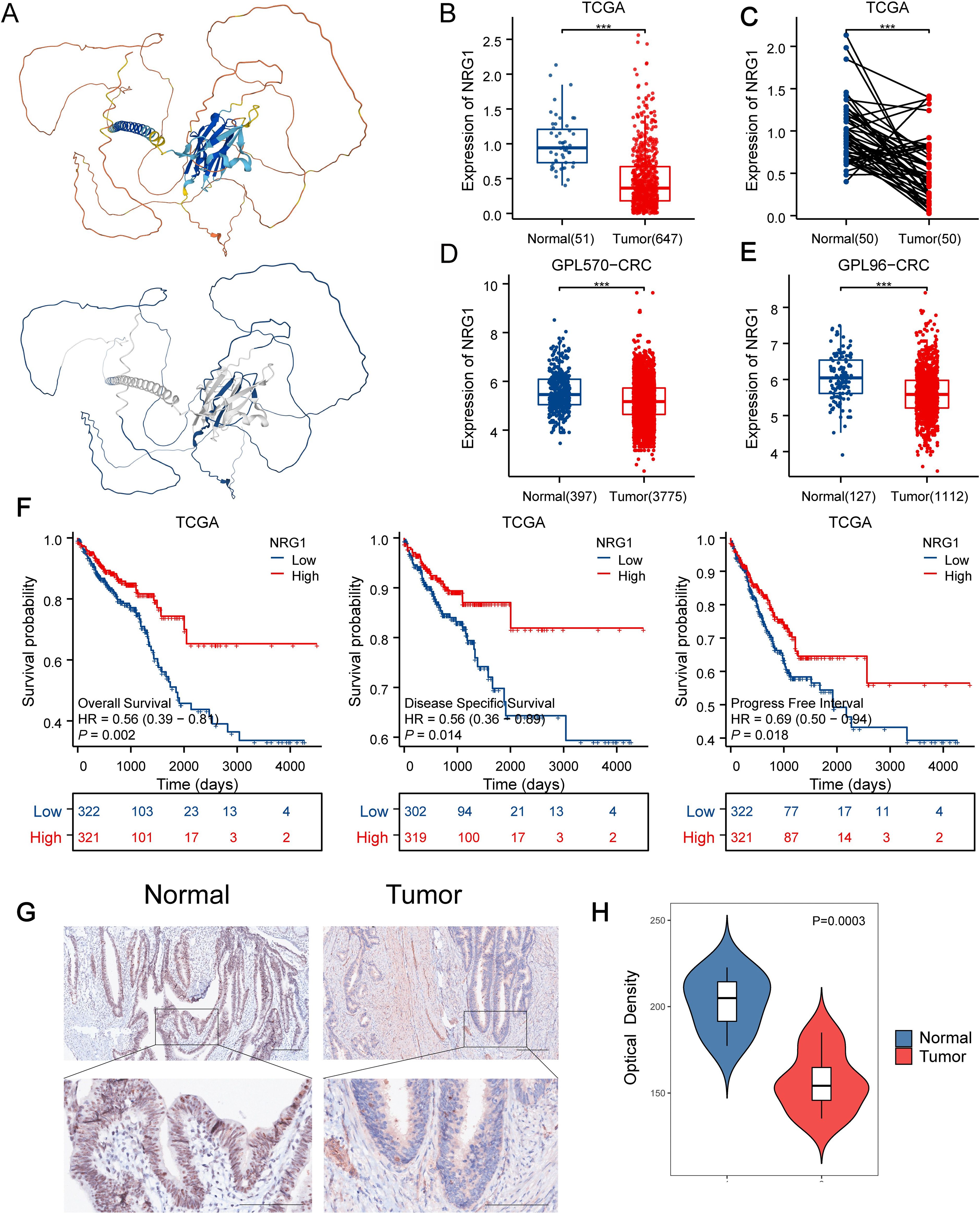 Diagram illustrating NRG1 expression differences and its impact on survival in tumor versus normal tissue. (A) NRG1 structure models. (B-E) Box plots showing higher NRG1 expression in tumor samples across various datasets. (F) Kaplan-Meier plots depict lower survival probabilities with higher NRG1 expression. (G) Histological images compare normal and tumor tissues. (H) Violin plot illustrates significant difference in optical density between normal and tumor tissues.