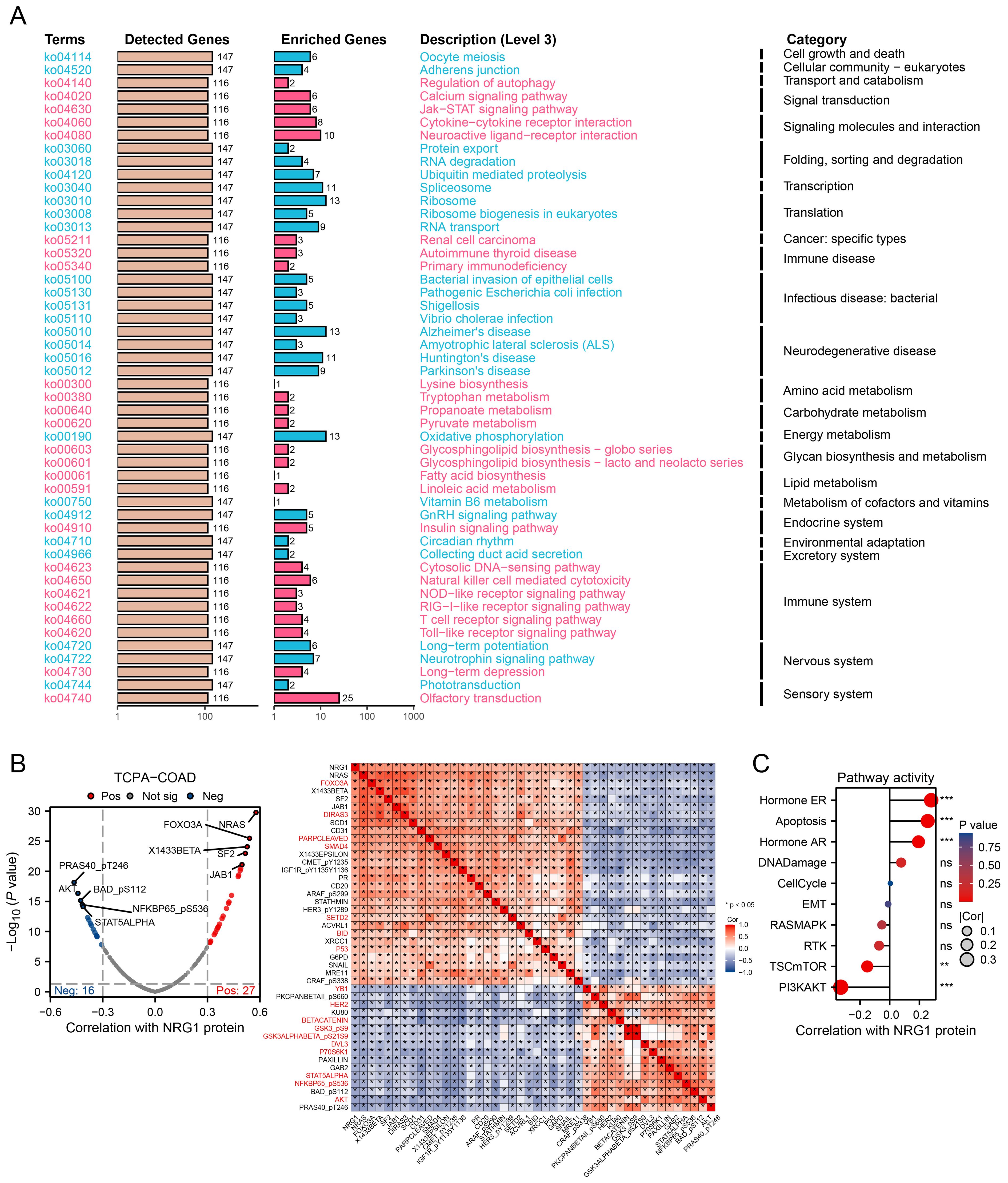 Building on the identification of NRG1 as the most critical MPRS gene, we performed a comprehensive analysis of its clinical and pathological relevance in CRC. Our results revealed that NRG1 expression is significantly lower in tumor tissues compared to normal tissues in TCGA, GPL570_CRC and GPL96_CRC cohort (Figures 8B-E). Kaplan-Meier (K-M) survival curves showed that patients with high NRG1 expression had better disease-specific survival (DSS) and progression-free interval (PFI) in the TCGA cohort (Figure 8F), with similar trends observed in three additional independent cohorts (Supplementary Figure S4B). Moreover, we performed IHC assays on CRC tissue samples from 7 patients (containing tumor and adjacent normal tissue), we observed significantly down-regulated expression levels of the NRG1 protein in colorectal tumor tissues compared with adjacent benign tissues, consistent with our bioinformatic findings (Figures 8G, H; Supplementary Figures S7A-F). An over-representation analysis was conducted on genes associated with NRG1 (P<0.05), identifying 50 significantly enriched terms with FDR < 0.05 (Figure 9A). Key enriched terms included neuroactive ligand-receptor interaction, spliceosome, ribosome, Alzheimer’s disease, Huntington’s disease, oxidative phosphorylation, and olfactory transduction. Additionally, most genes were enriched in categories such as folding, sorting and degradation; infectious diseases (bacterial); neurodegenerative diseases; immune system; and nervous system (Figure 9A). Subsequently, univariate Cox regression analysis was used to evaluate the association between NRG1 and 223 proteins from the TCPA database. A volcano plot showed 27 proteins positively correlated and 16 proteins negatively correlated with NRG1. A heatmap further revealed that tumor-suppressive proteins (FOXO3A, DIRAS3, cleaved PARP, SMAD4, CD20, and P53) were positively correlated with NRG1, while oncogenic proteins (YB1, PKCβII, HER2, β-catenin, GSK3, and AKT) were negatively correlated with NRG1. This suggested that NRG1 exerts a protective role in CRC (Figure 9B). Pathway analysis indicated that NRG1 promotes apoptosis and inhibits oncogenic pathways such as mTOR and PI3K/AKT (Figure 9C). Collectively, these findings support that NRG1 functions as a tumor suppressor in CRC, where low expression is associated with poor prognosis and high expression correlates with improved survival.