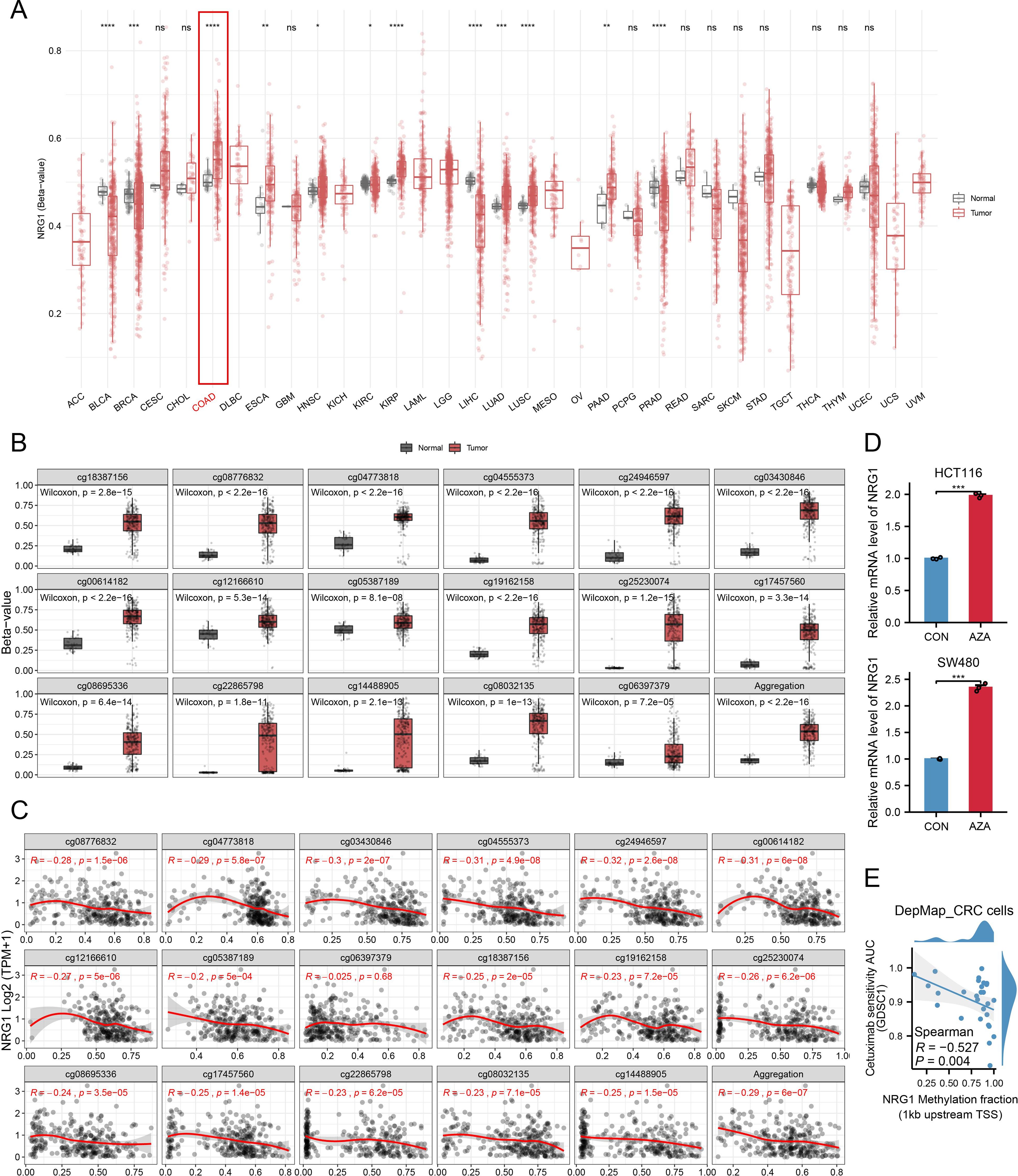The MART (Shiny Methylation Analysis Resource Tool) App, available at http://www.bioinfo-zs.com/smartapp, is a web-based tool designed for analyzing DNA methylation patterns in human cancers (30). In this study, NRG1 methylation levels were analyzed using DNA methylation data via the SMART (Shiny Methylation Analysis Resource Tool) App (http://www.bioinfo-zs). The prognostic significance of NRG1 DNA methylation in CRC patients was explored using SurvivalMeth (http://bio-bigdata.hrbmu.edu.cn/survivalmeth/) (31). HCT116 and SW480 cells were treated with 10 μM Aza (Sigma-Aldrich, St. Louis, MO, USA) for 72 hours, after which total RNA was extracted for qRT-PCR analysis.