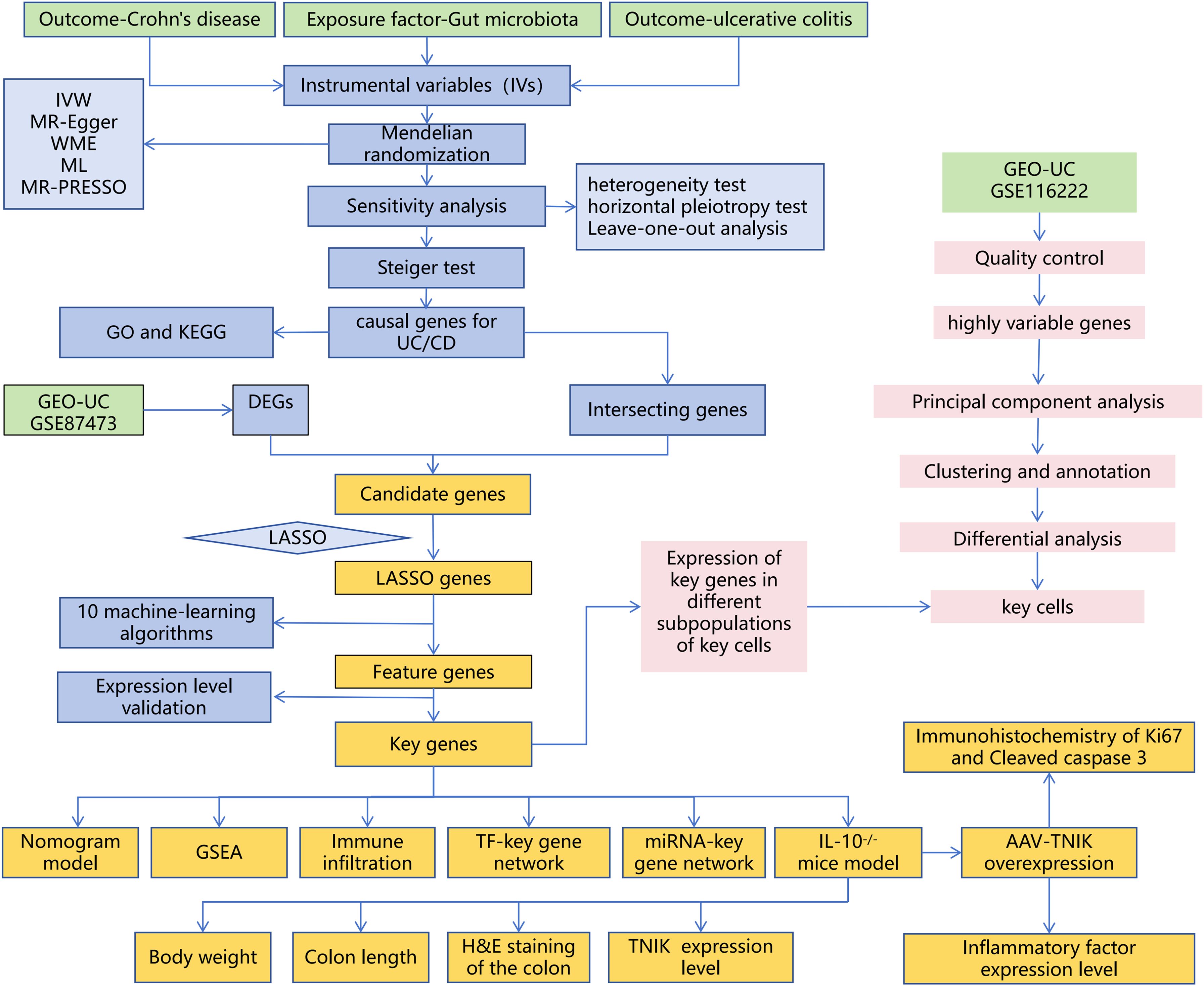 Results: MR analysis identified 307 and 360 GM-associated causal genes for UC and CD, respectively. TNIK (TRAF2 and NCK-interacting kinase) was highlighted as a key candidate gene. Seven TNIK-associated immune cell subsets showed altered infiltration in UC. Single-cell transcriptomics revealed TNIK dysregulation in colonocytes, goblet cells. T/NK cells in UC. TNIK overexpression in IL-10-/- mice reduced disease severity and downregulated IL-1β, IL-6, and TNF-α. Immunohistochemistry confirmed that TNIK overexpression enhanced Ki67 expression and reduced Cleaved caspase 3 expression.