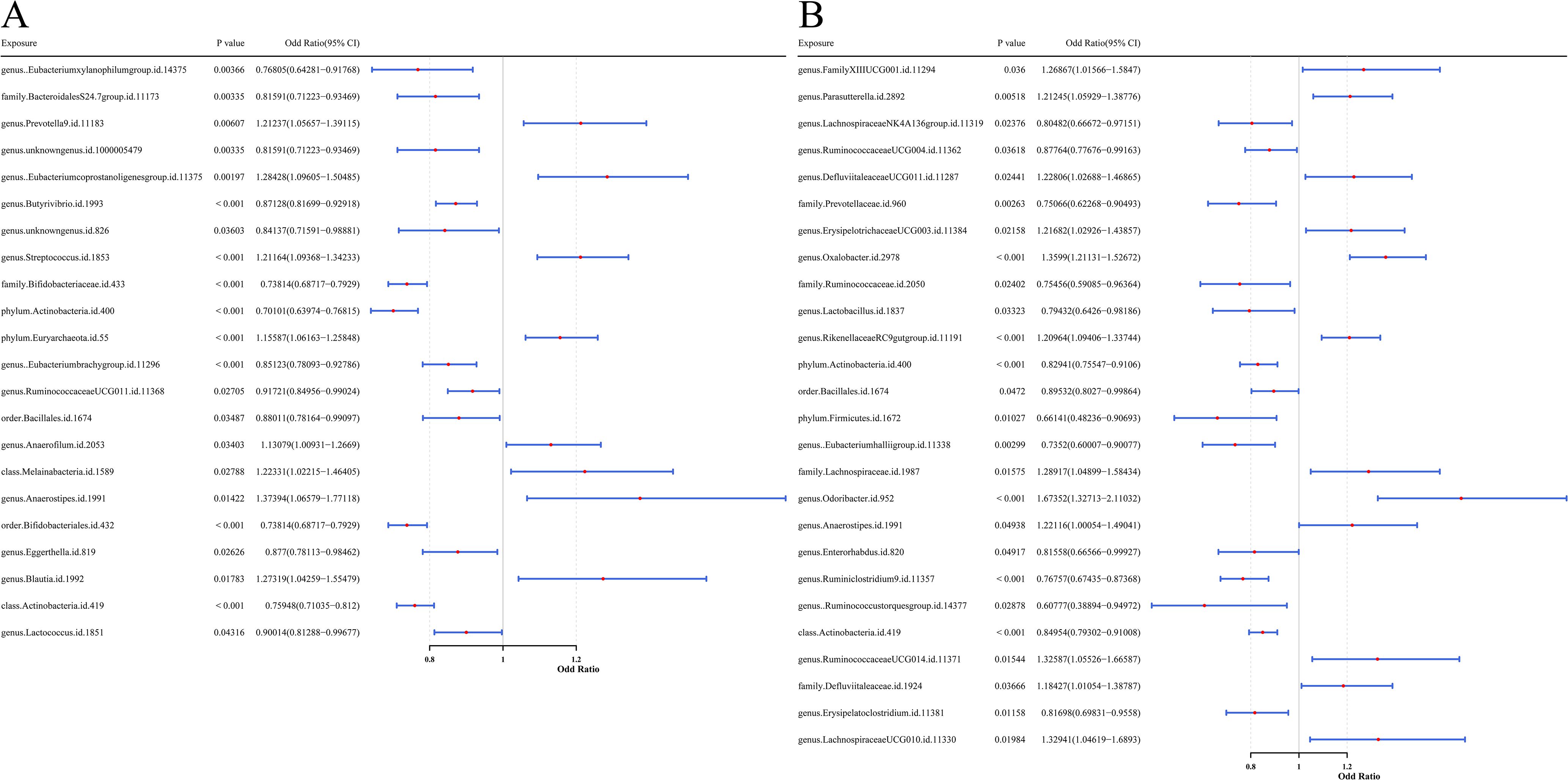 Figure 2. Forest plots presenting the predictive results of causal relationships from MR analysis. (A) Results with GM as the exposure factor and UC as the outcome variable. (B) Results with GM as the exposure factor and CD as the outcome variable. Each plot illustrates the OR with 95% CI, providing evidence for potential causal associations between microbial features and disease outcomes.