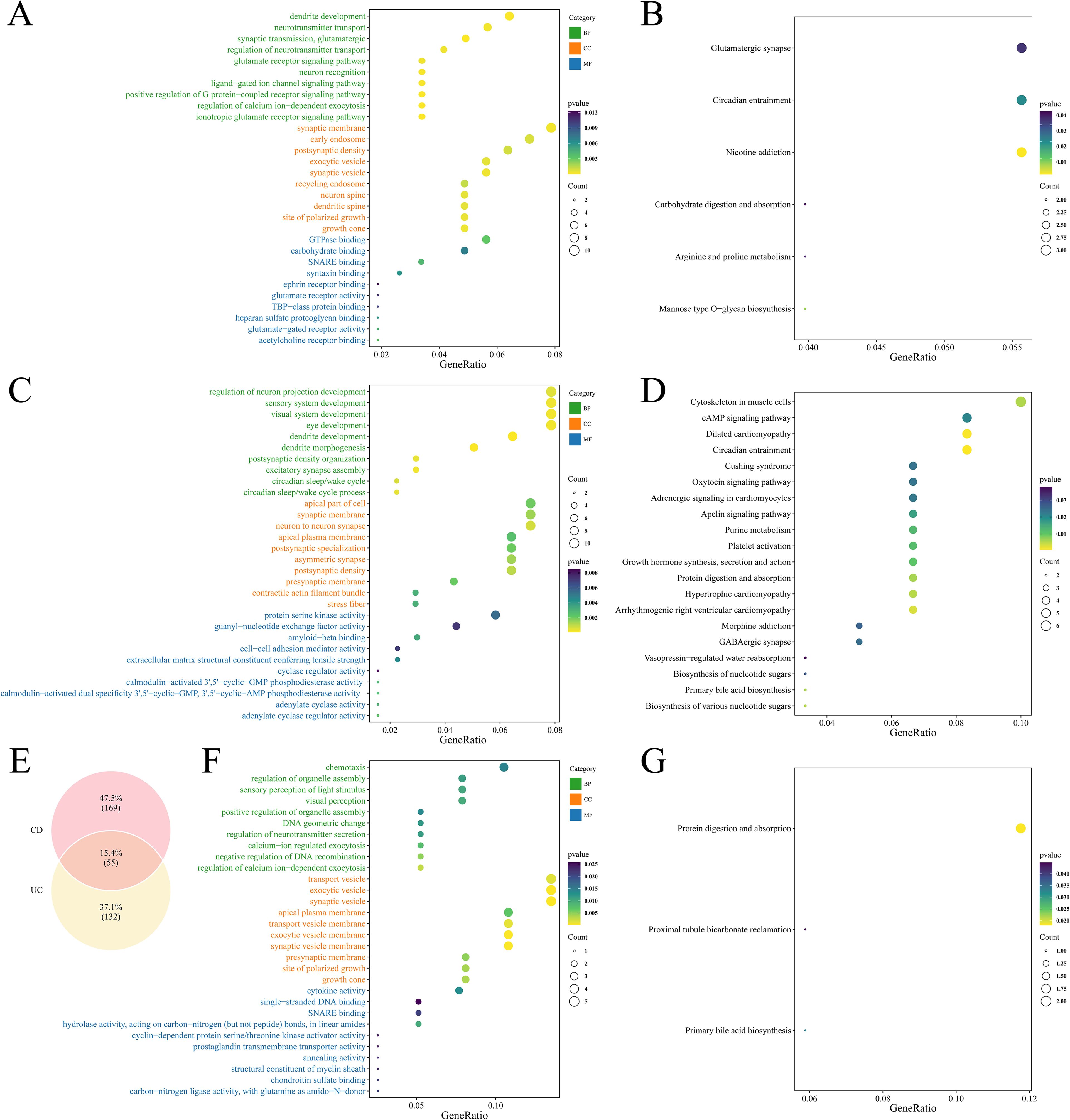 Cluster of dot plots labeled A to G, showing gene set enrichment analysis results. Each plot displays categories with varying dot sizes and colors. Dot size represents count, and color denotes p-value significance. Plot E features a Venn diagram showing overlaps between CD and UC categories, with percentages and numbers. Plots illustrate concepts like synaptic signaling, circadian entrainment, and metabolism. Gene ratio is on the x-axis. Plots explore different biological processes and pathways, with varying themes based on function and significance levels.