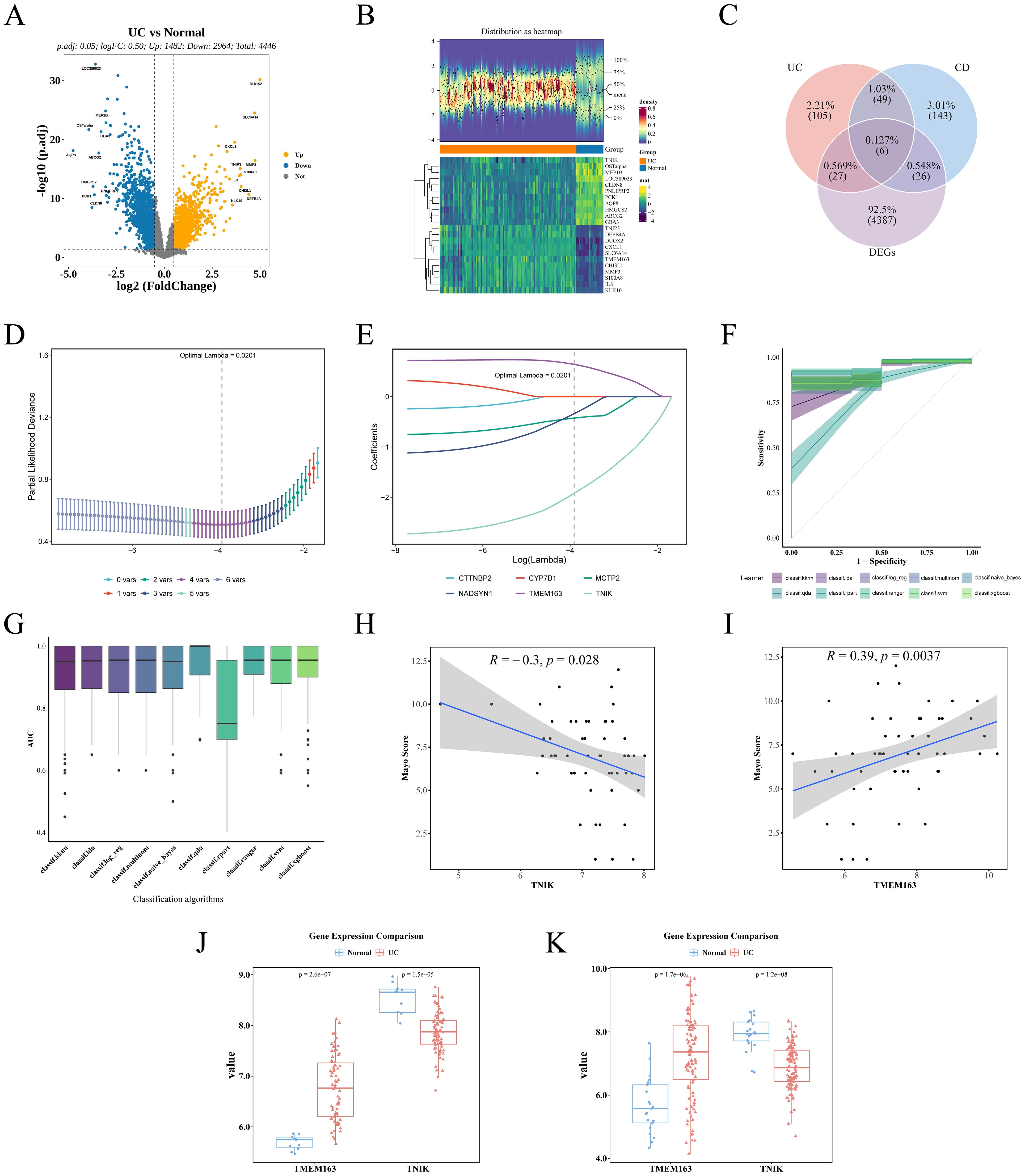 A set of images displaying various scientific data visualizations related to gene expression and disease analysis.   A: A volcano plot showing the distribution of log2 fold changes and significance levels for genes, highlighting upregulated and downregulated genes.  B: A heatmap illustrating gene expression distribution across different sample groups, showing clustering patterns.  C: A Venn diagram comparing unique and shared differentially expressed genes among UC, CD, and generalized DEGs.  D: A plot of relative likelihood deviance versus Log(Lambda) indicating the optimal lambda value for the model.  E: A coefficient plot for various genes against Log(Lambda) with an optimal lambda indicated.  F: A cumulative chart showing sensitivity and specificity for different learning classifiers.  G: Box plots showing AUC values across different models, indicating model performance.  H and I: Scatter plots with correlation coefficients and p-values showing relationships between specific genes and map scores, with fitted lines.  J and K: Box plots comparing gene expression between normal and diseased states for two genes, TMEM163 and TNIK, with p-values indicating significance.