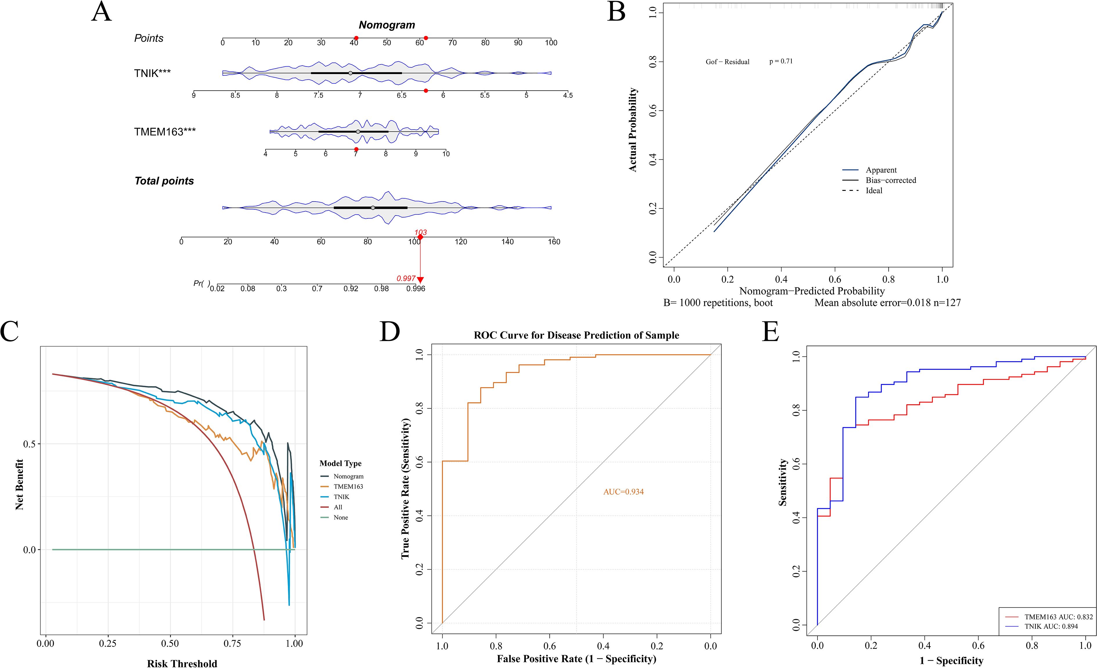 Figure 5. Construction of a nomogram for risk prediction. (A) Nomogram-based prediction model. (B) Calibration curve evaluating the nomogram’s predictive performance. (C) DCA curves of TMEM163 and TNIK. (D) ROC curves of the nomogram model. (E) ROC curves of TMEM163 and TNIK. This figure demonstrated the translational potential of incorporating molecular markers into clinical risk prediction.