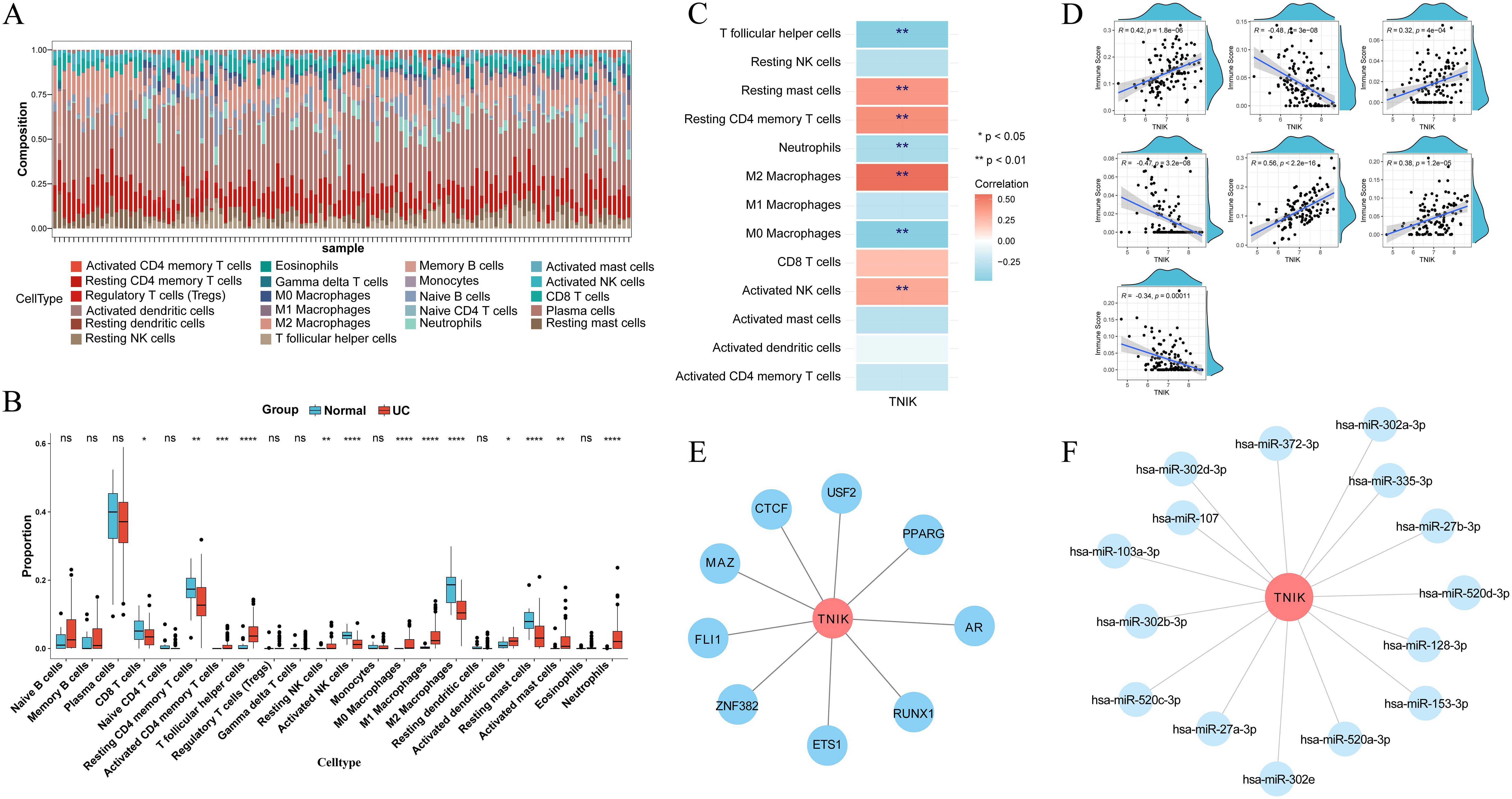 Panel A shows a bar chart depicting cell type composition across samples, with various immune cells represented by different colors. Panel B displays a box plot comparing cell proportions between normal and UC groups, highlighting significant differences. Panel C includes a heatmap of cell type correlations with TNIK expression, annotated with significance levels. Panel D presents scatter plots demonstrating correlations between TNIK and immunity scores. Panel E features a network diagram connecting TNIK with various genes. Panel F displays a network of TNIK interacting with different microRNAs.