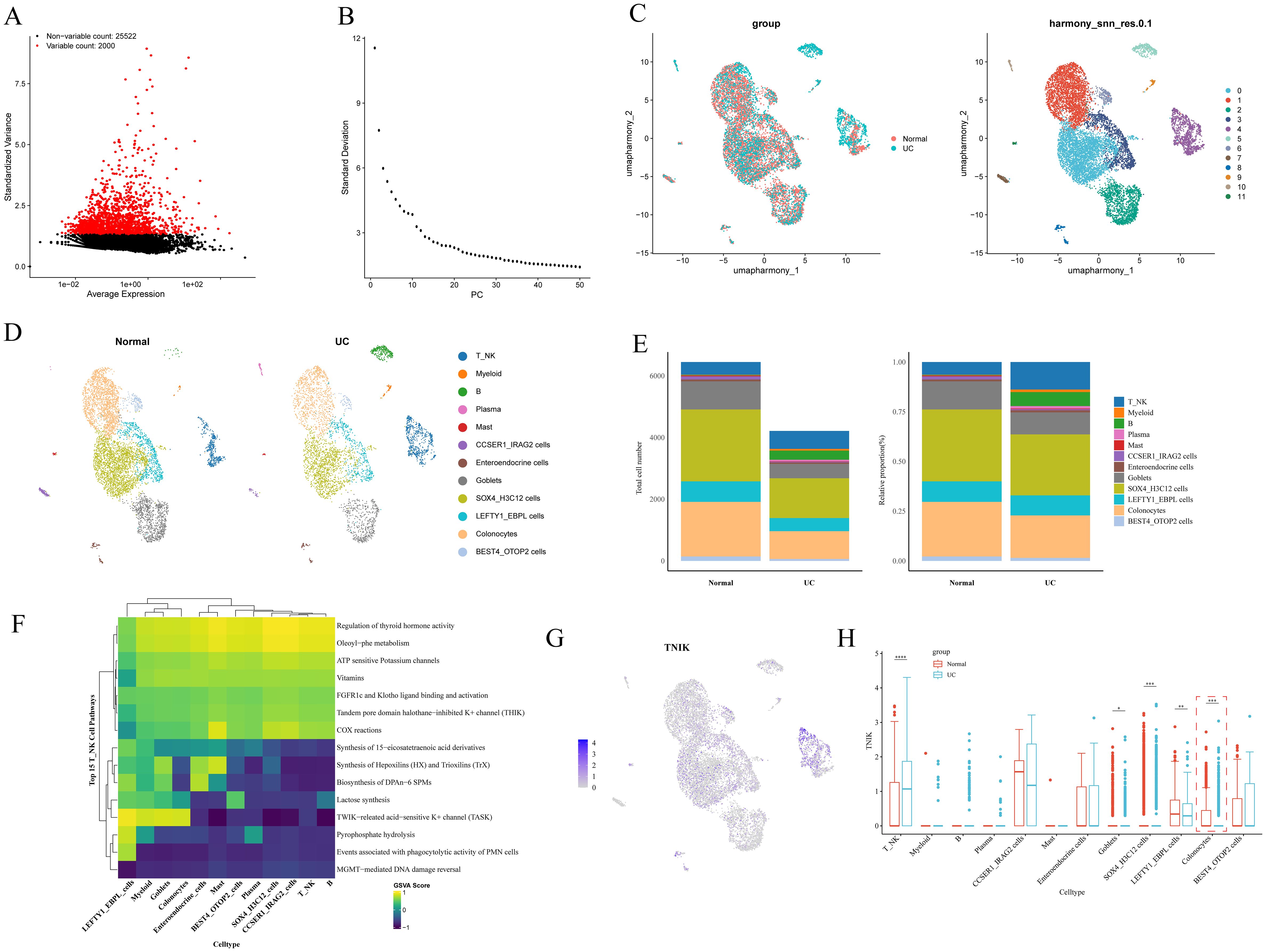 Figure 7. Key cell screening results. (A) Graph of screening results for highly variable genes. Highly variable genes are shown in red. (B) Principal component ElbowPlot. (C) Cell clustering and annotation UMAP plot. (D) Plot of cell type distribution in each subgroup. (E) Differential results plot of the proportion of cell types. (F) Differential cell function enrichment analysis plot. (G) The UMAP plot of TNIK expression in differential cells. (H) Plot of the results of differential expression of TNIK between groups in each differential cell. This figure highlighted the specific cell subsets contributing to TNIK dysregulation in IBD. Statistical significance: *P < 0.05, **P < 0.01, ***P < 0.001 and ****P < 0.0001.