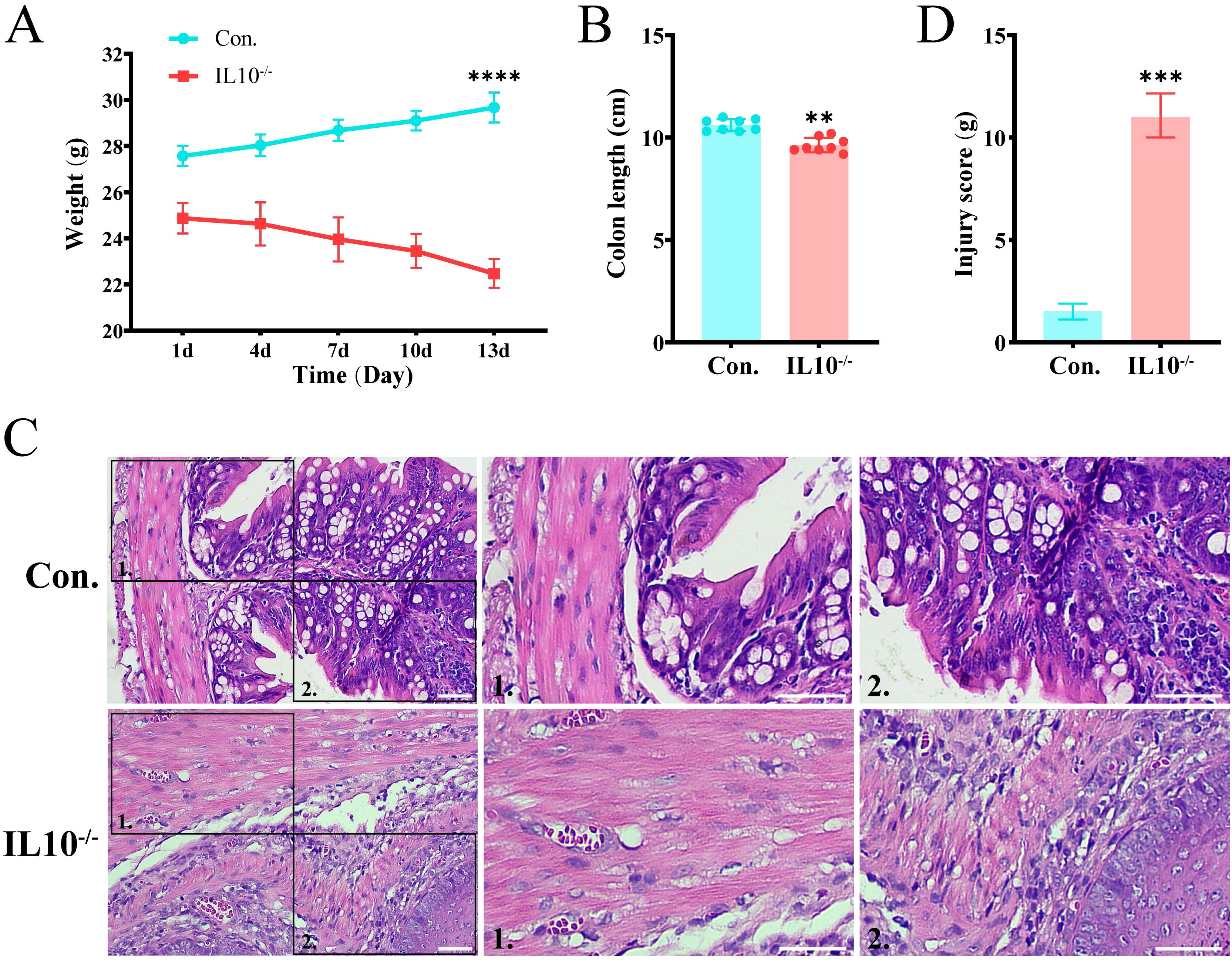 Figure 8. IBD symptoms in IL-10-/- mice. (A) Body weight changes of mice. (B) Comparison of colon lengths in different groups. (C) H&E staining of mouse colon sections. Scale bars, 50 µm. (D) The quantitative histological scoring results of H&E staining. Data are presented as mean ± SD. Statistical significance was determined by unpaired t-test. These results confirmed that IL-10-/- mice develop IBD-like symptoms. Statistical significance: **P < 0.01, ***P < 0.001 and ****P < 0.0001.