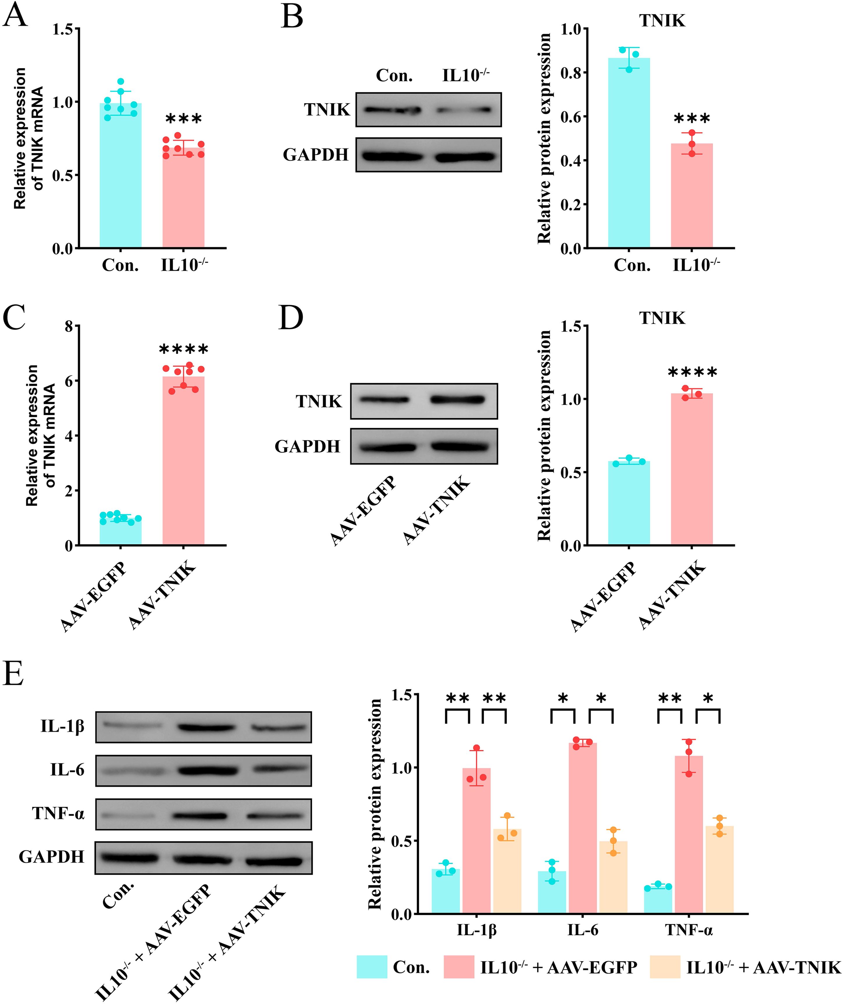Bar and protein expression graphs illustrate relative TNIK mRNA and protein expression in different conditions. Panel A shows TNIK mRNA expression comparing control and IL10 knockout. Panel B displays TNIK protein expression under similar conditions. Panel C compares TNIK mRNA expression between AAV-EGFP and AAV-TNIK groups. Panel D shows TNIK protein expression for these groups. Panel E compares protein expressions of IL-1β, IL-6, and TNF-α among control, IL10 knockout with AAV-EGFP, and IL10 knockout with AAV-TNIK. Statistical significance is indicated with asterisks.